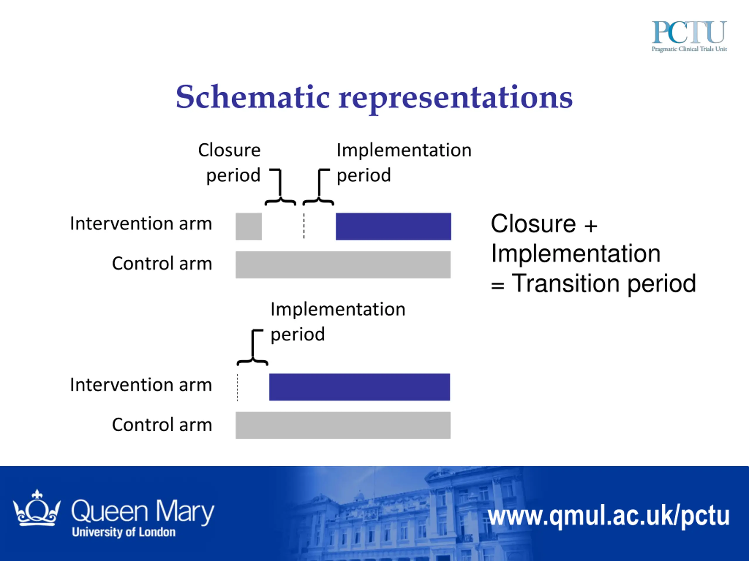 Schematic representations Closure period{ Implementation period { Closure + Implementation = Transition period Intervention arm Control arm Implementation period { Intervention arm Control arm www.qmul.ac.uk/pctu