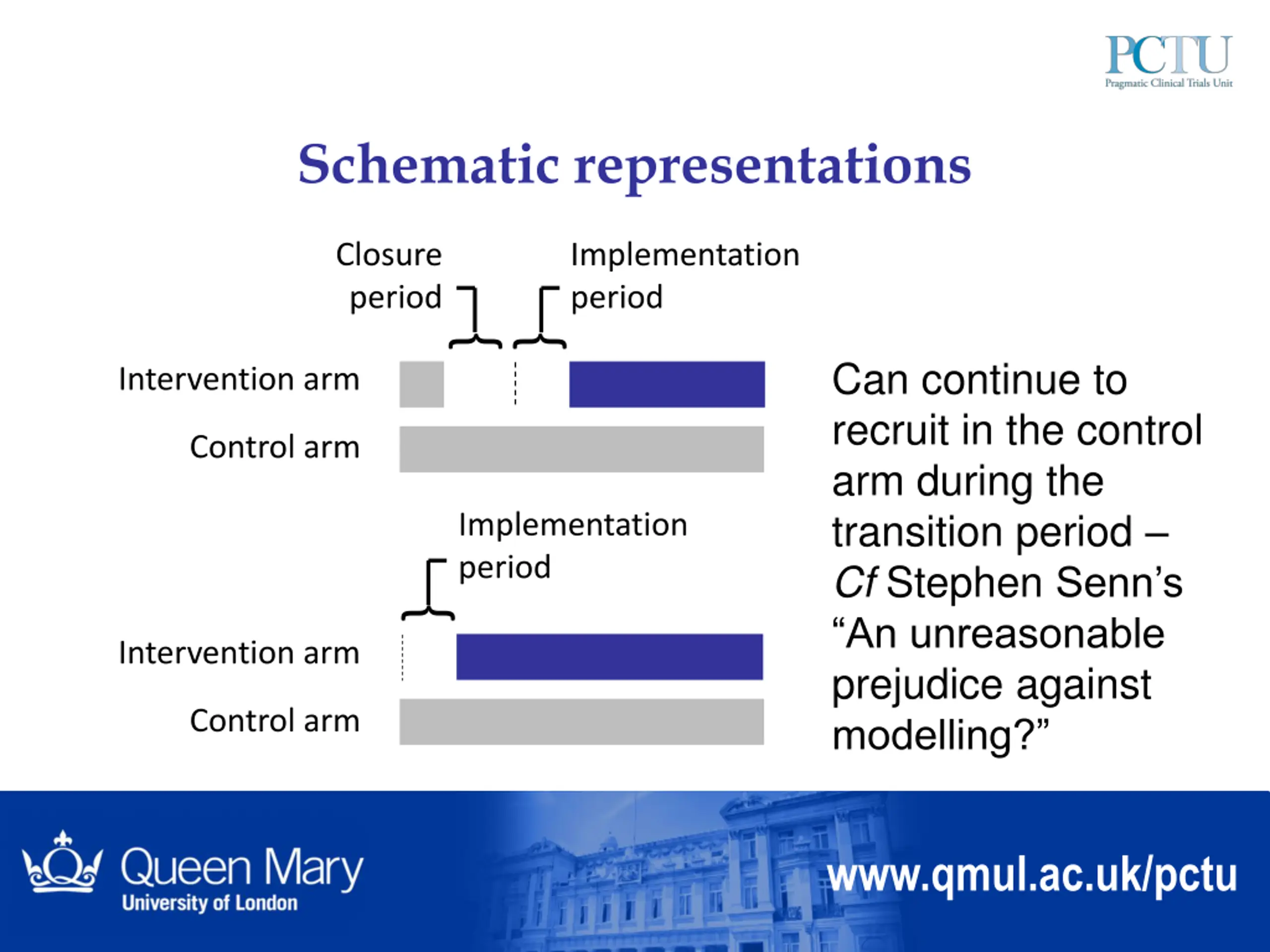 Schematic representations Closure period{ Implementation period { Can continue to recruit in the control arm during the transition period Cf Stephen Senn s An unreasonable prejudice against modelling? Intervention arm Control arm Implementation period { Intervention arm Control arm www.qmul.ac.uk/pctu