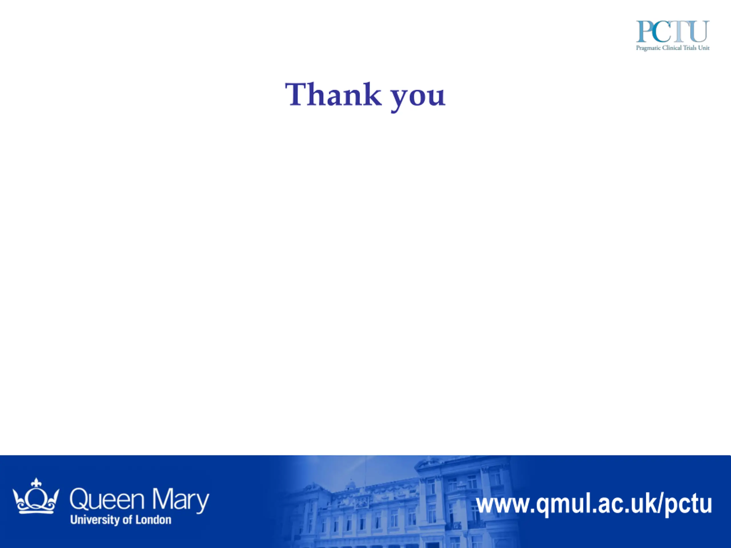 Conclusions If m, r or are small then it may not be worth having a baseline period If the closure period is long and the implementation period is short then it may not be worth having a baseline period As gets smaller the precise timing of the baseline period (if one is needed) becomes less crucial It is important to adjust appropriately for the time effect, but the usual benefits of parsimony also apply www.qmul.ac.uk/pctu