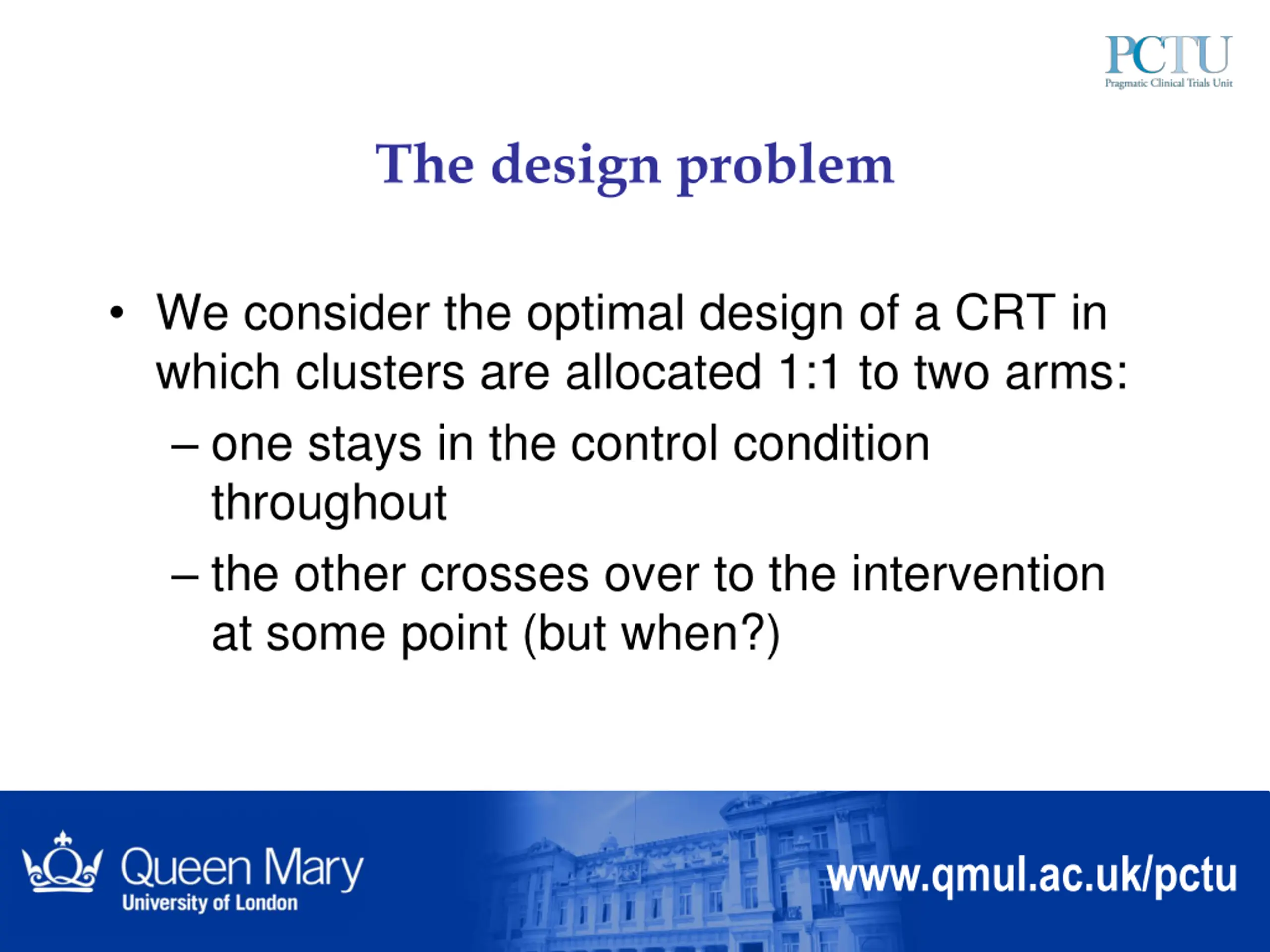 The design problem We consider the optimal design of a CRT in which clusters are allocated 1:1 to two arms: one stays in the control condition throughout the other crosses over to the intervention at some point (but when?) www.qmul.ac.uk/pctu