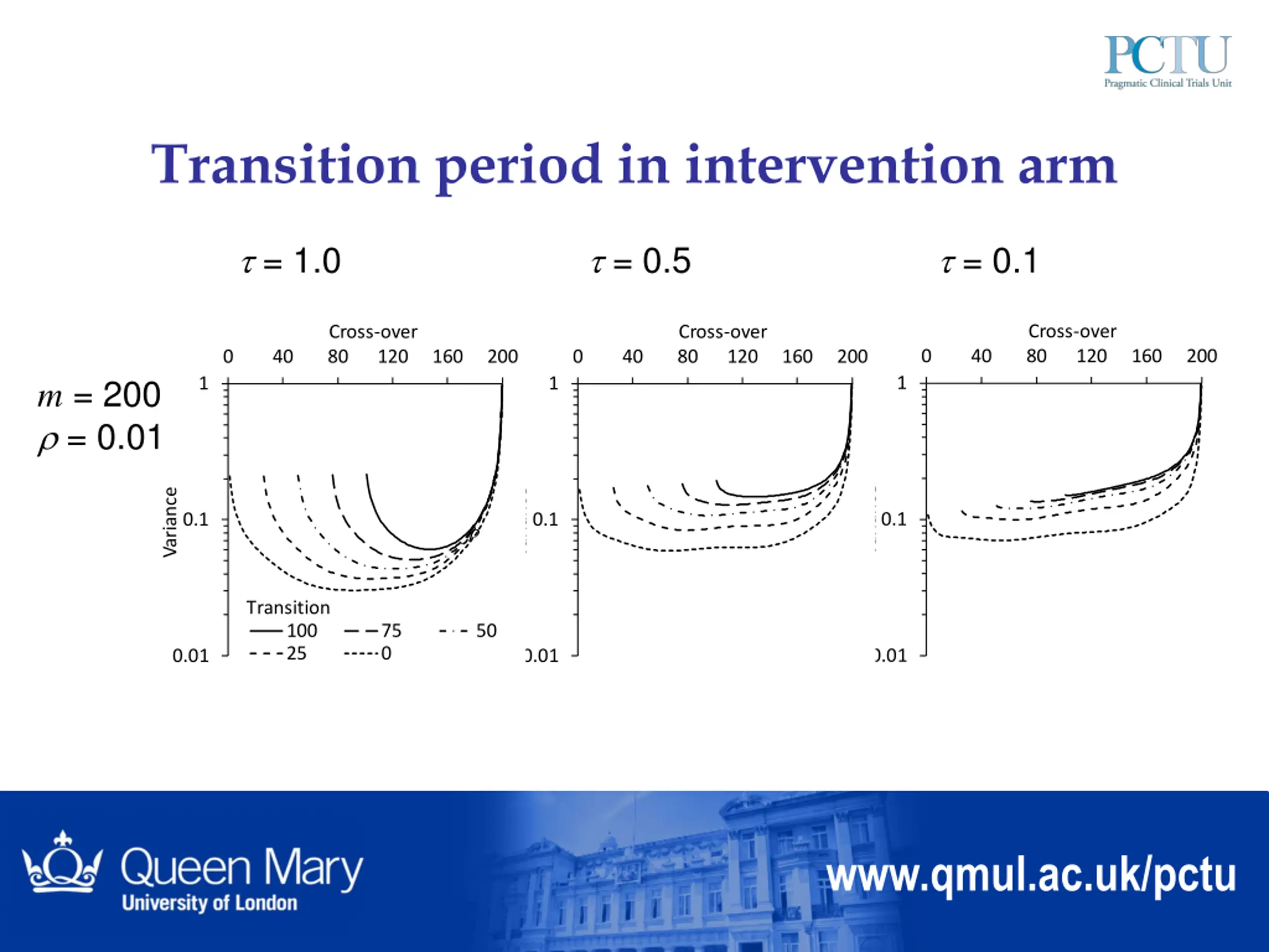 Transition period in intervention arm = 1.0 = 0.5 = 0.1 Cross-over Cross-over Cross-over 0 40 80 120 160 200 0 40 80 120 160 200 0 40 80 120 160 200 m = 200 r = 0.01 1 1 1 Variance Variance Variance 0.1 0.1 0.1 r Transition 100 25 75 0 50 0.01 0.01 0.01 www.qmul.ac.uk/pctu