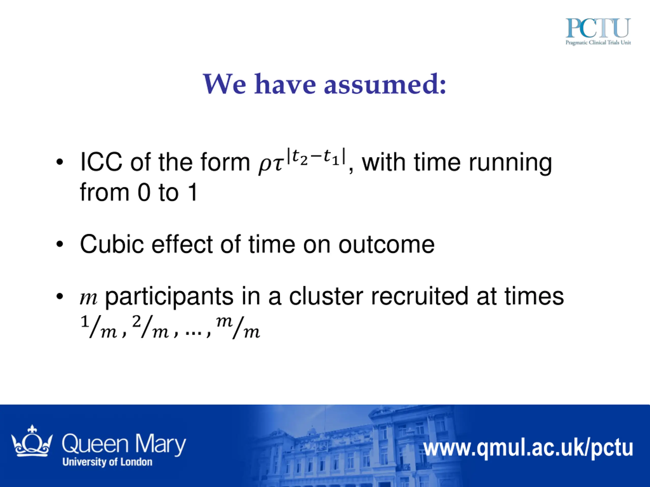 We have assumed: ICC of the form ???2 ?1, with time running from 0 to 1 Cubic effect of time on outcome m participants in a cluster recruited at times 1?, ?? 2?, , www.qmul.ac.uk/pctu