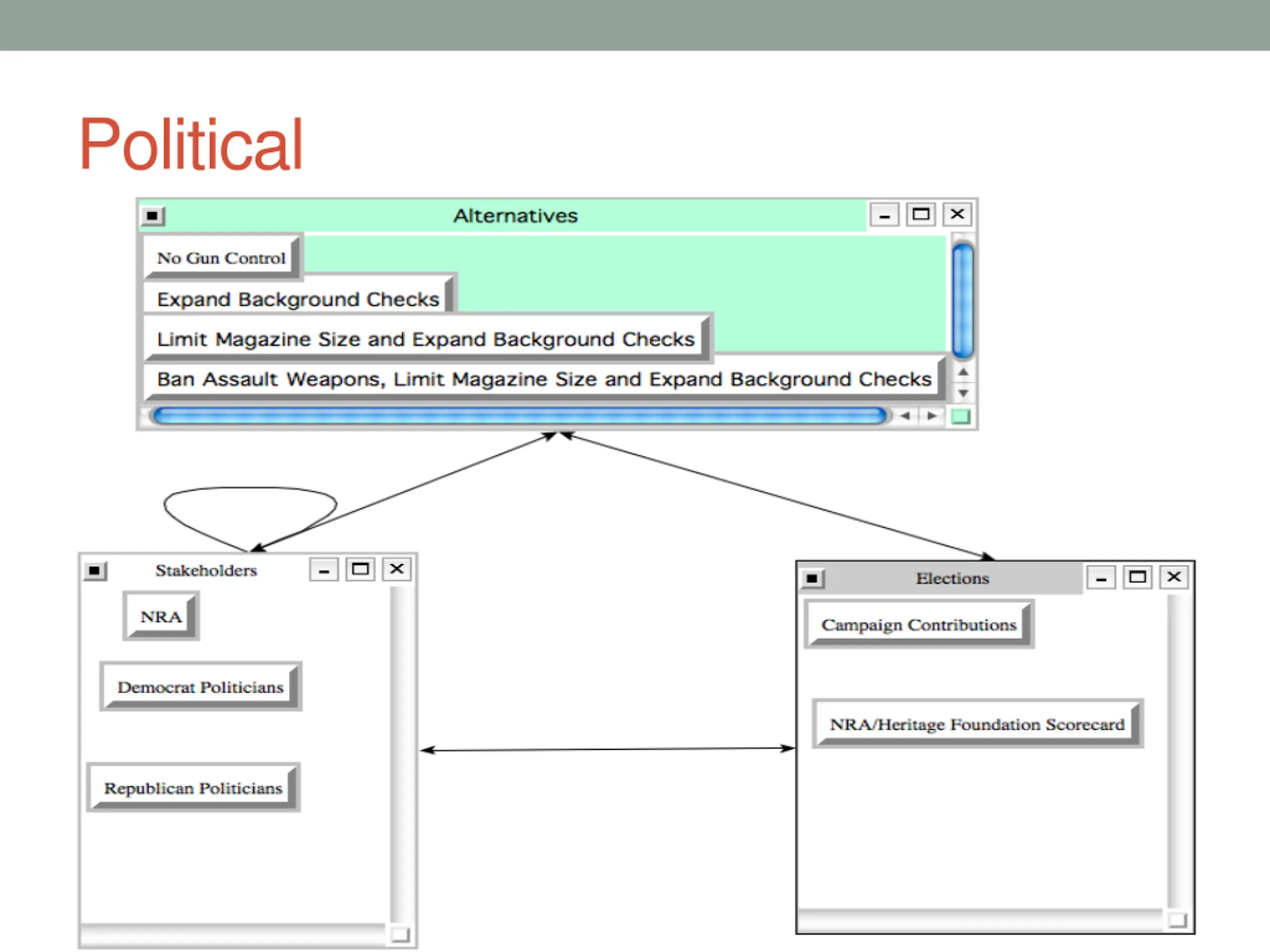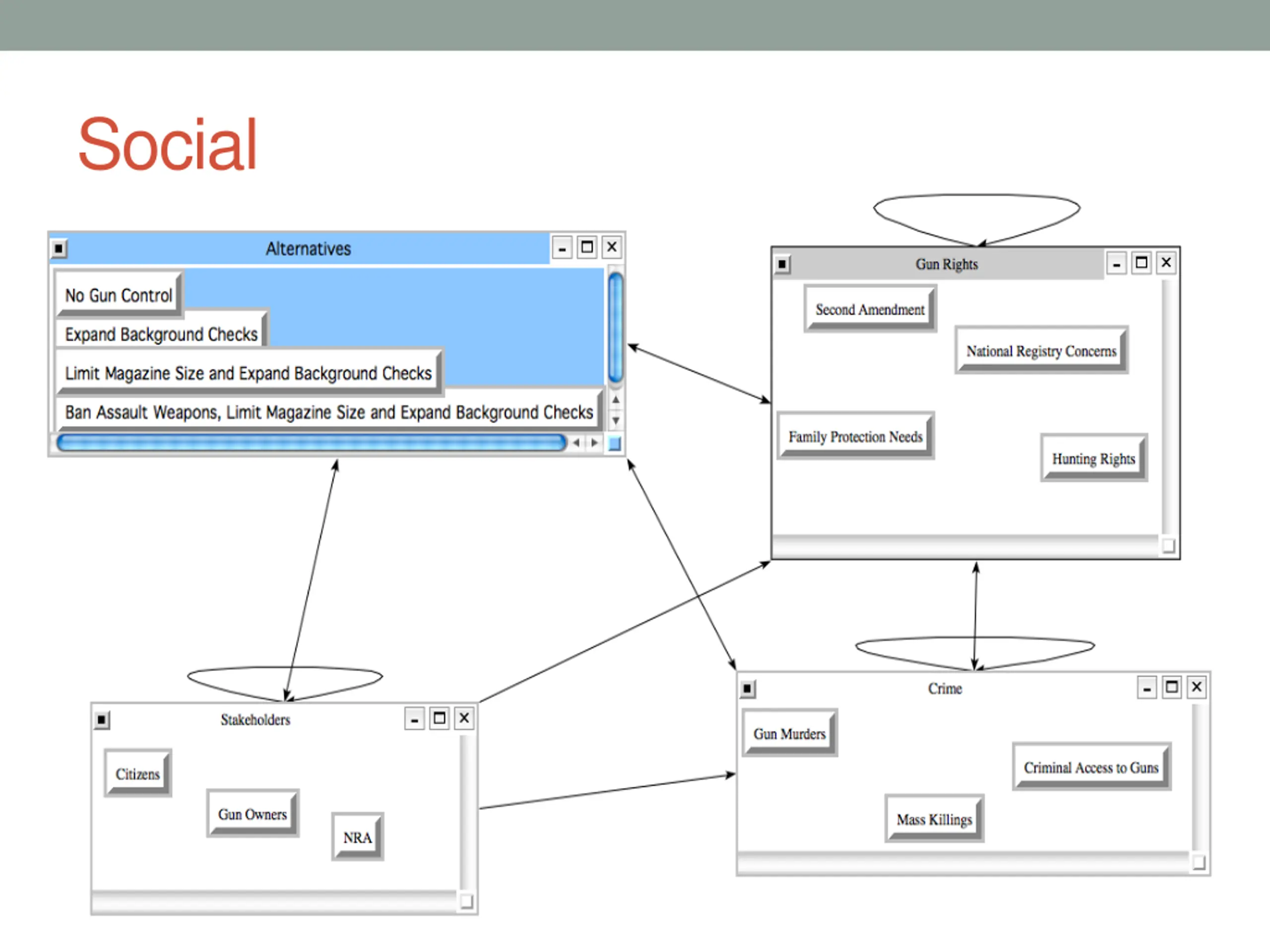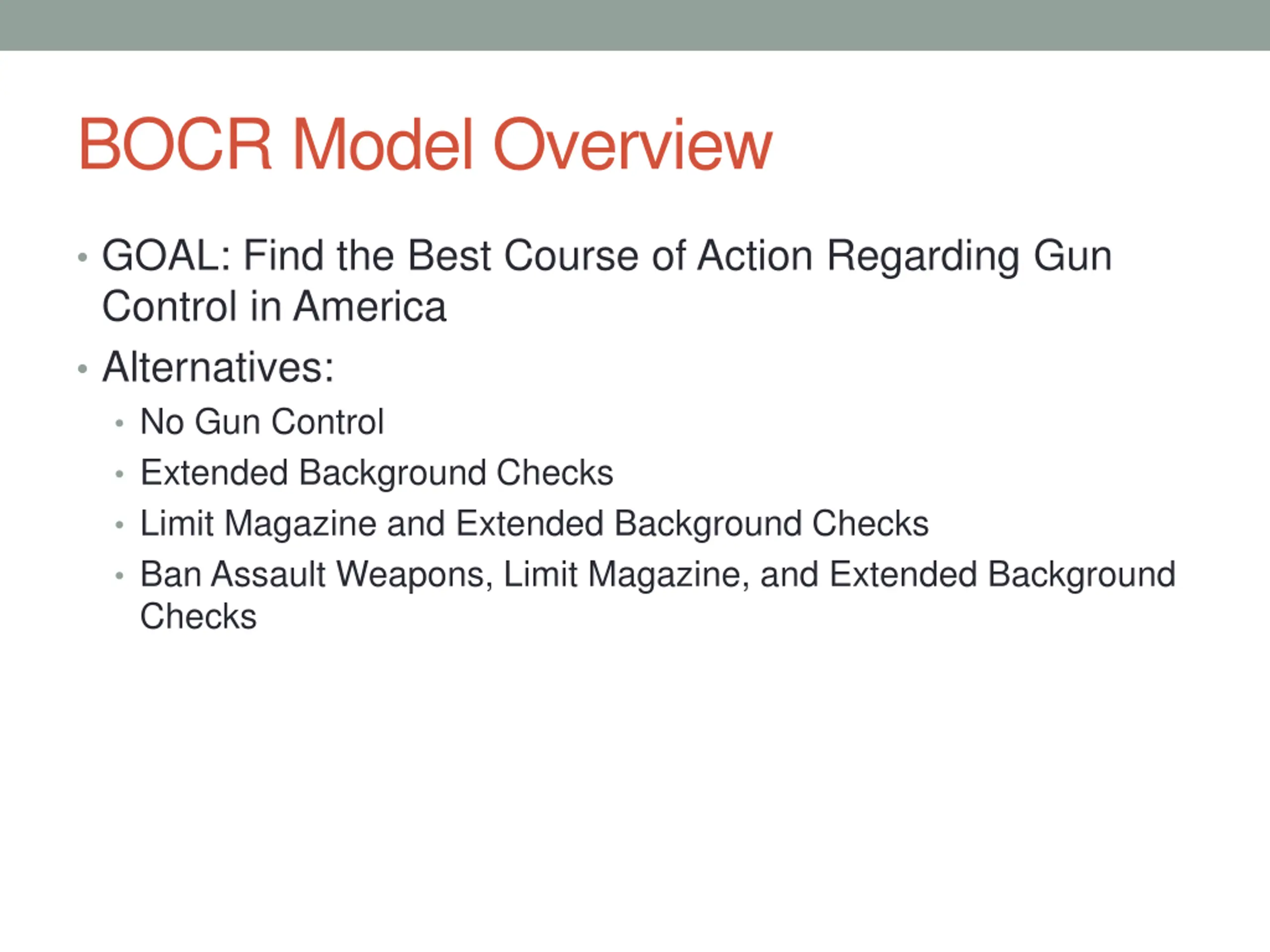 BOCR Model Overview GOAL: Find the Best Course of Action Regarding Gun Control in America Alternatives: No Gun Control Extended Background Checks Limit Magazine and Extended Background Checks Ban Assault Weapons, Limit Magazine, and Extended Background Checks