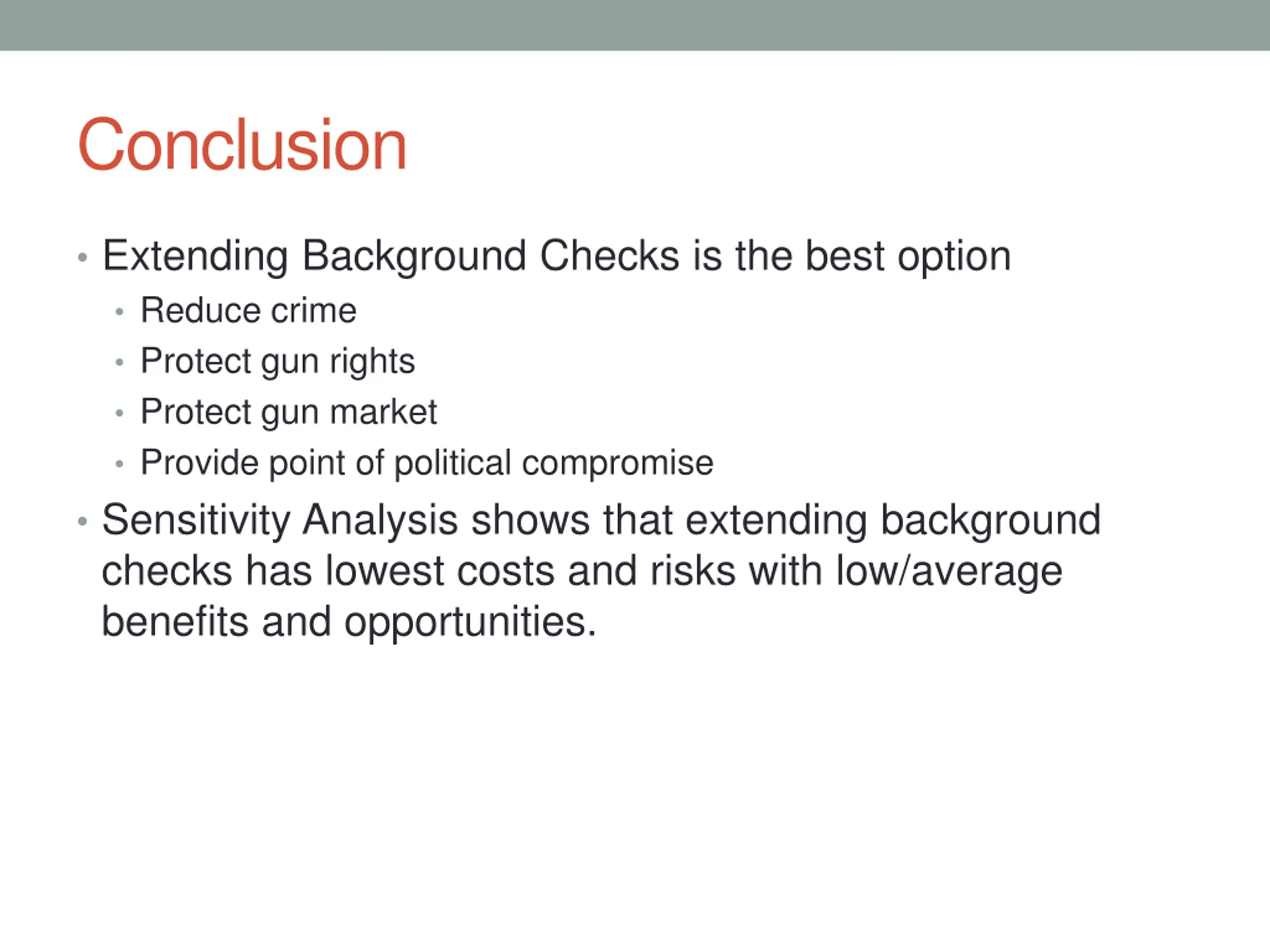 Conclusion Extending Background Checks is the best option Reduce crime Protect gun rights Protect gun market Provide point of political compromise Sensitivity Analysis shows that extending background checks has lowest costs and risks with low/average benefits and opportunities.