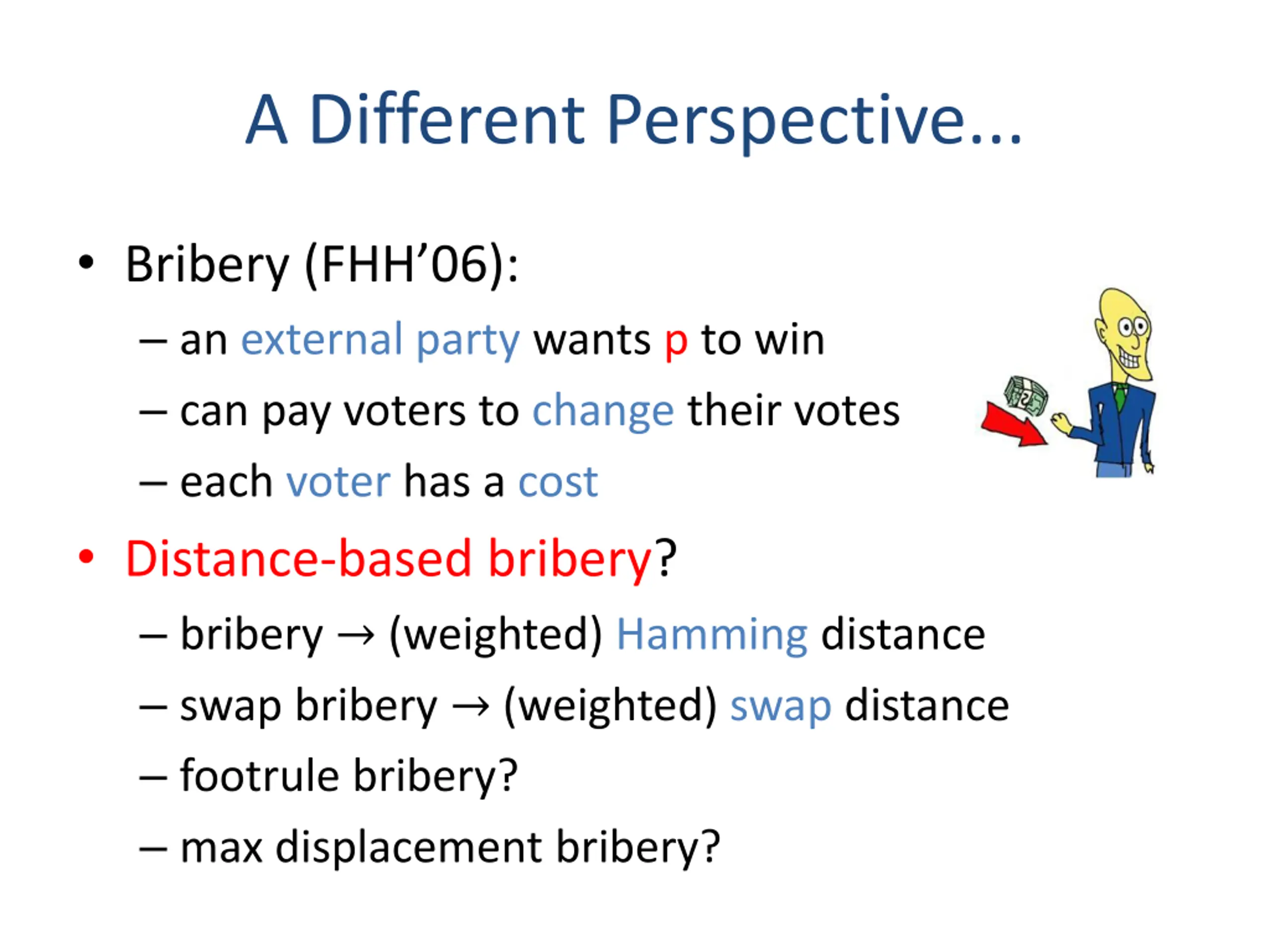 A Different Perspective... Bribery (FHH 06): an external party wants p to win can pay voters to change their votes each voter has a cost Distance-based bribery? bribery (weighted) Hamming distance swap bribery (weighted) swap distance footrule bribery? max displacement bribery?