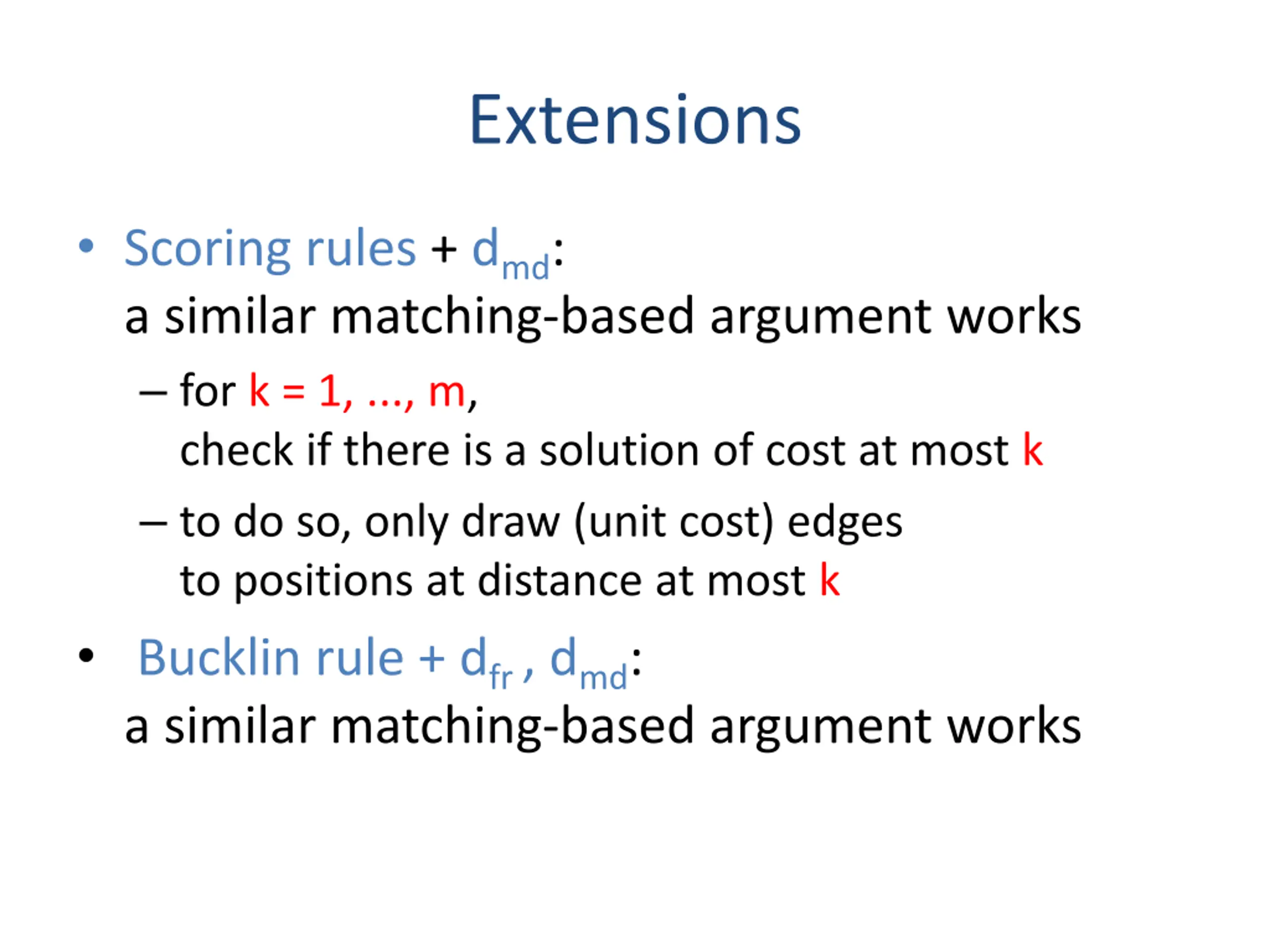 Extensions Scoring rules + dmd: a similar matching-based argument works for k = 1, ..., m, check if there is a solution of cost at most k to do so, only draw (unit cost) edges to positions at distance at most k Bucklin rule + dfr , dmd: a similar matching-based argument works