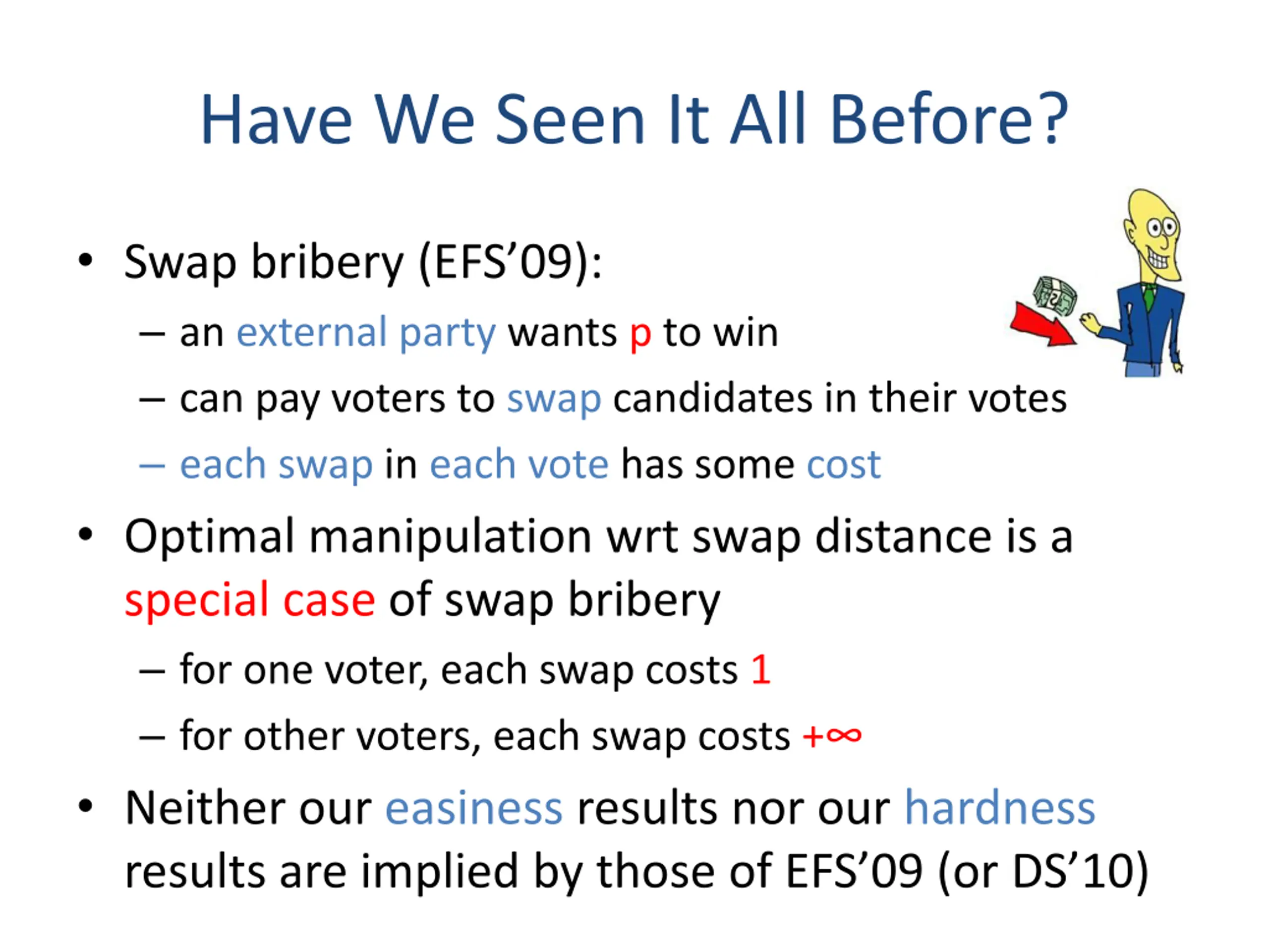 Have We Seen It All Before? Swap bribery (EFS 09): an external party wants p to win can pay voters to swap candidates in their votes each swap in each vote has some cost Optimal manipulation wrt swap distance is a special case of swap bribery for one voter, each swap costs 1 for other voters, each swap costs + Neither our easiness results nor our hardness results are implied by those of EFS 09 (or DS 10)