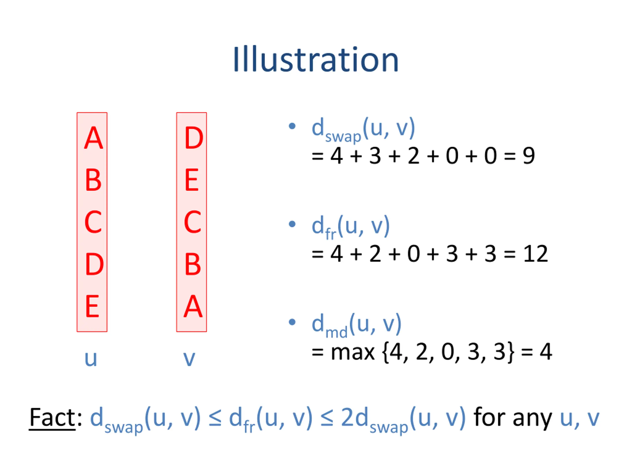 Illustration dswap(u, v) = 4 + 3 + 2 + 0 + 0 = 9 A B C D E D E C B A dfr(u, v) = 4 + 2 + 0 + 3 + 3 = 12 dmd(u, v) = max {4, 2, 0, 3, 3} = 4 u v Fact: dswap(u, v) dfr(u, v) 2dswap(u, v) for any u, v