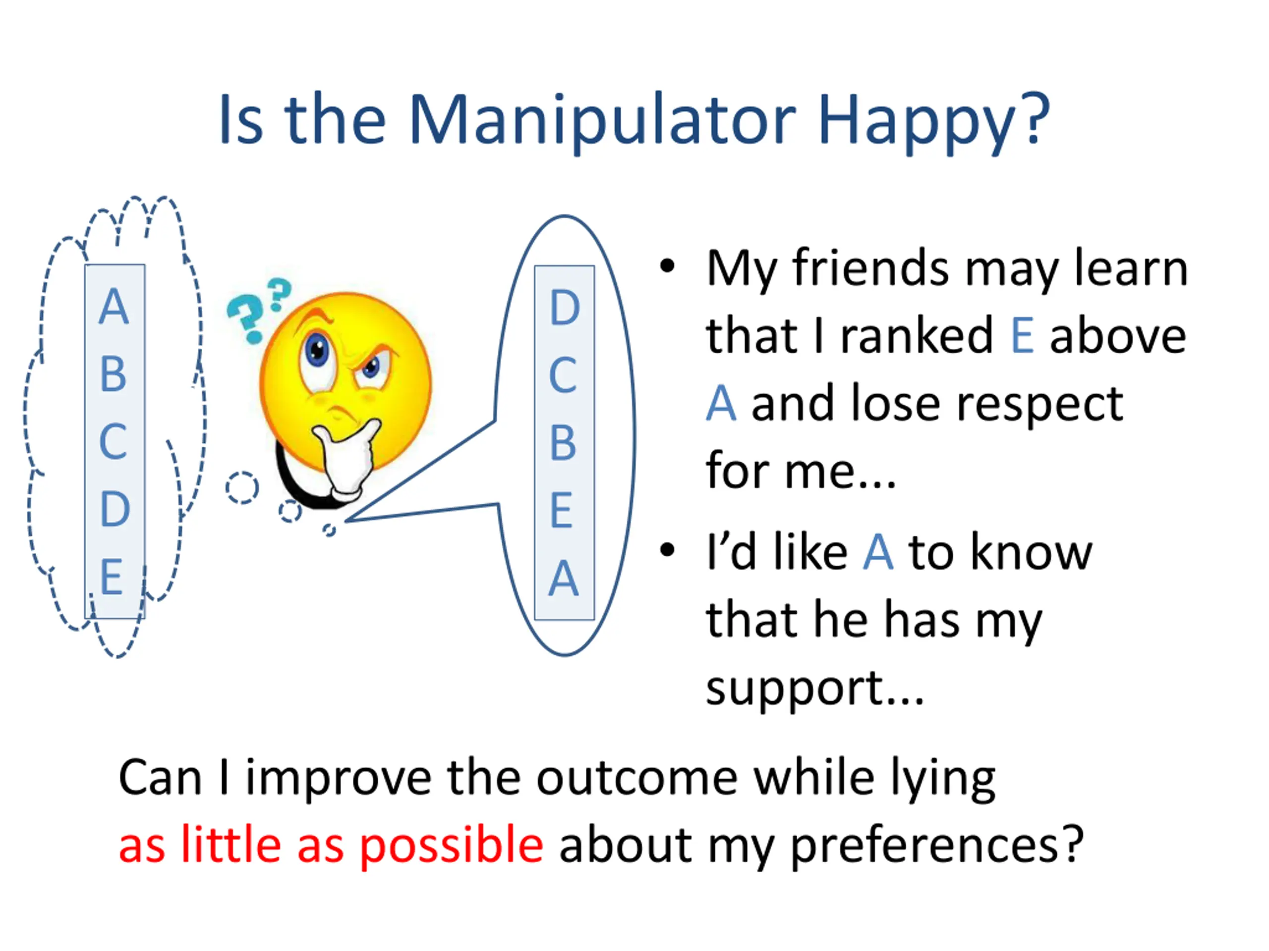 Is the Manipulator Happy? My friends may learn that I ranked E above A and lose respect for me... I d like A to know that he has my support... A B C D E D C B E A Can I improve the outcome while lying as little as possible about my preferences?