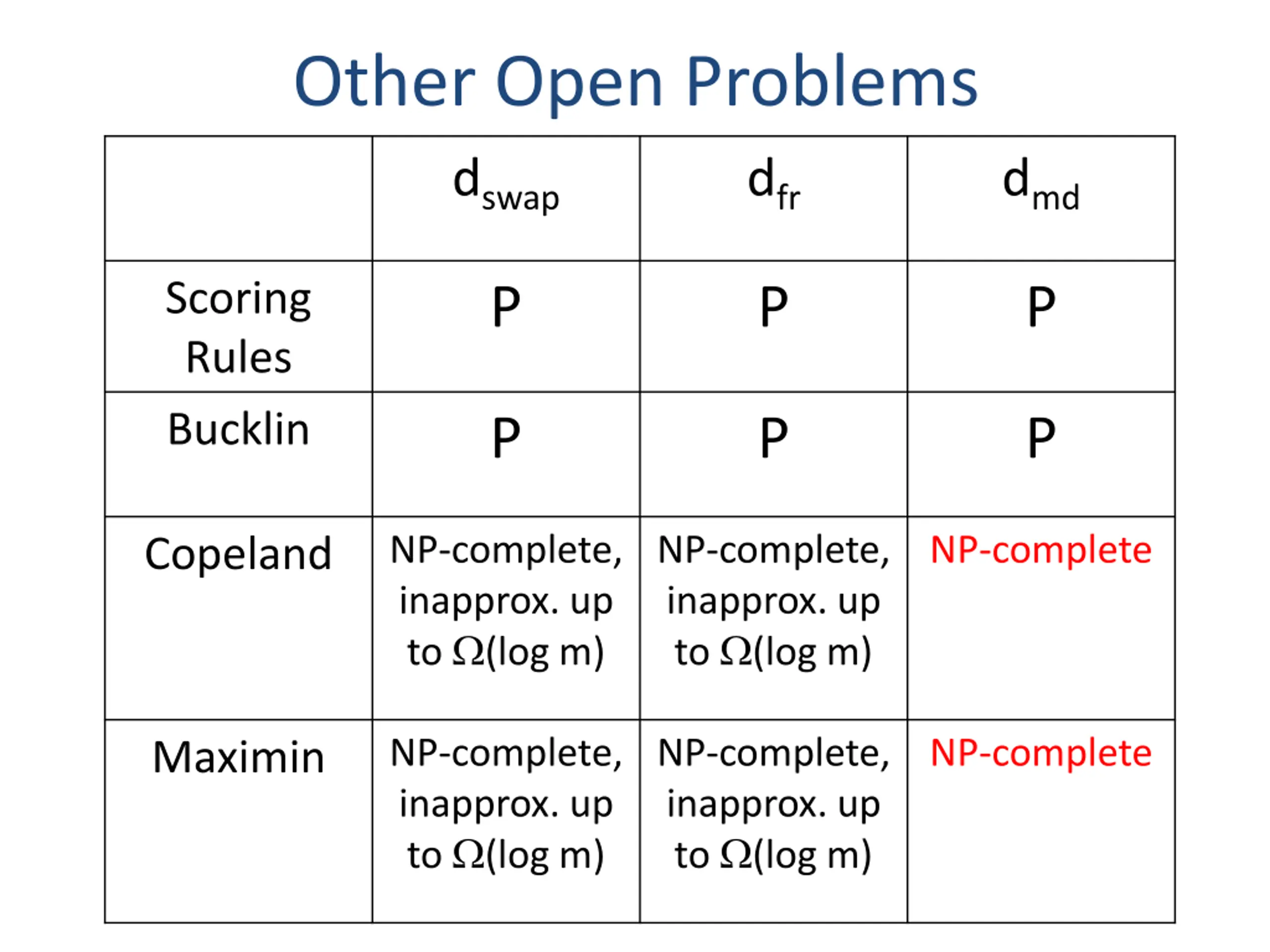 Other Open Problems dswap dfr dmd Scoring Rules Bucklin P P P P P P NP-complete, inapprox. up to (log m) NP-complete, inapprox. up to (log m) NP-complete Copeland NP-complete, inapprox. up to (log m) NP-complete, inapprox. up to (log m) NP-complete Maximin