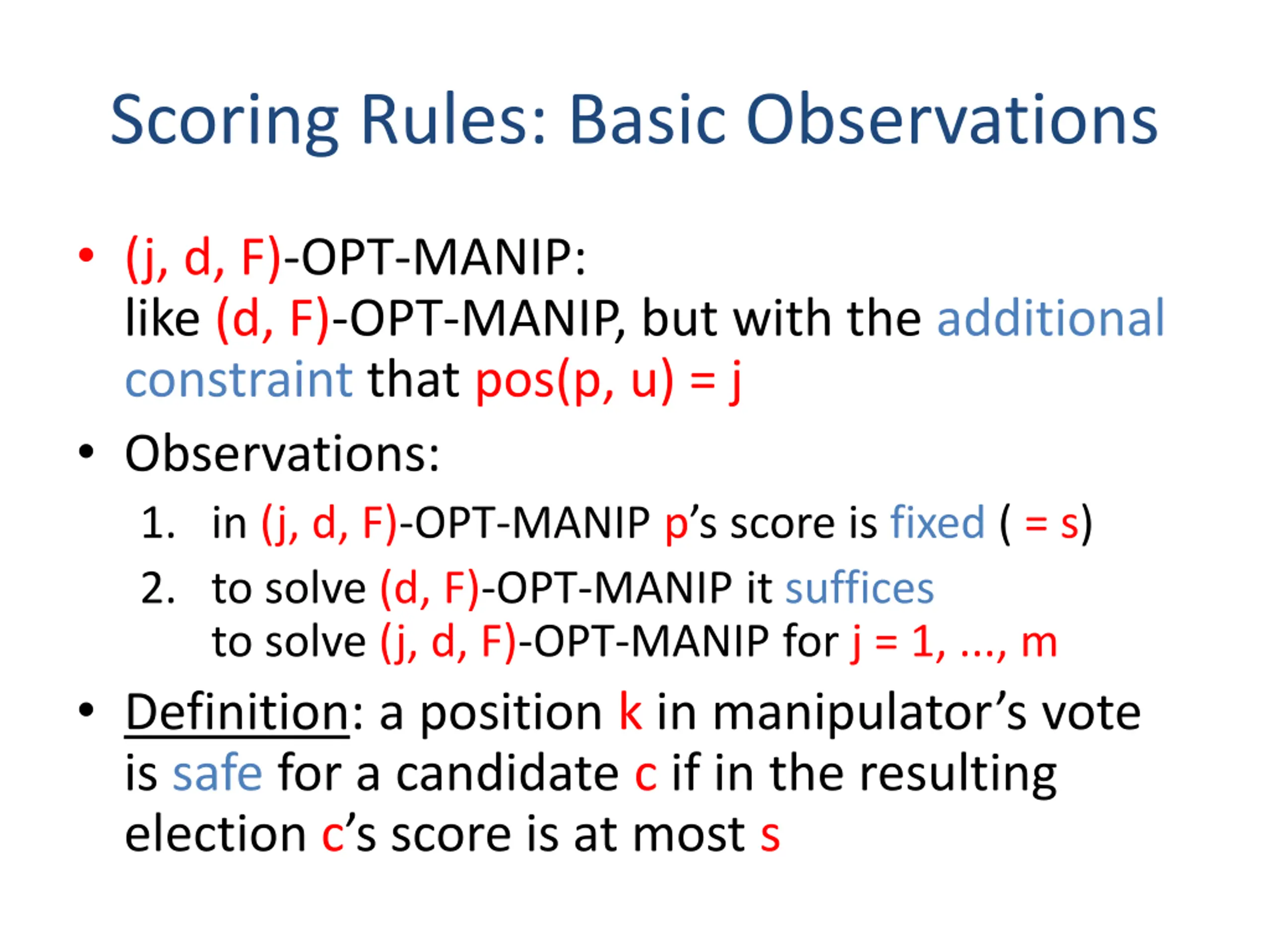 Scoring Rules: Basic Observations (j, d, F)-OPT-MANIP: like (d, F)-OPT-MANIP, but with the additional constraint that pos(p, u) = j Observations: 1. in (j, d, F)-OPT-MANIP p s score is fixed ( = s) 2. to solve (d, F)-OPT-MANIP it suffices to solve (j, d, F)-OPT-MANIP for j = 1, ..., m Definition: a position k in manipulator s vote is safe for a candidate c if in the resulting election c s score is at most s