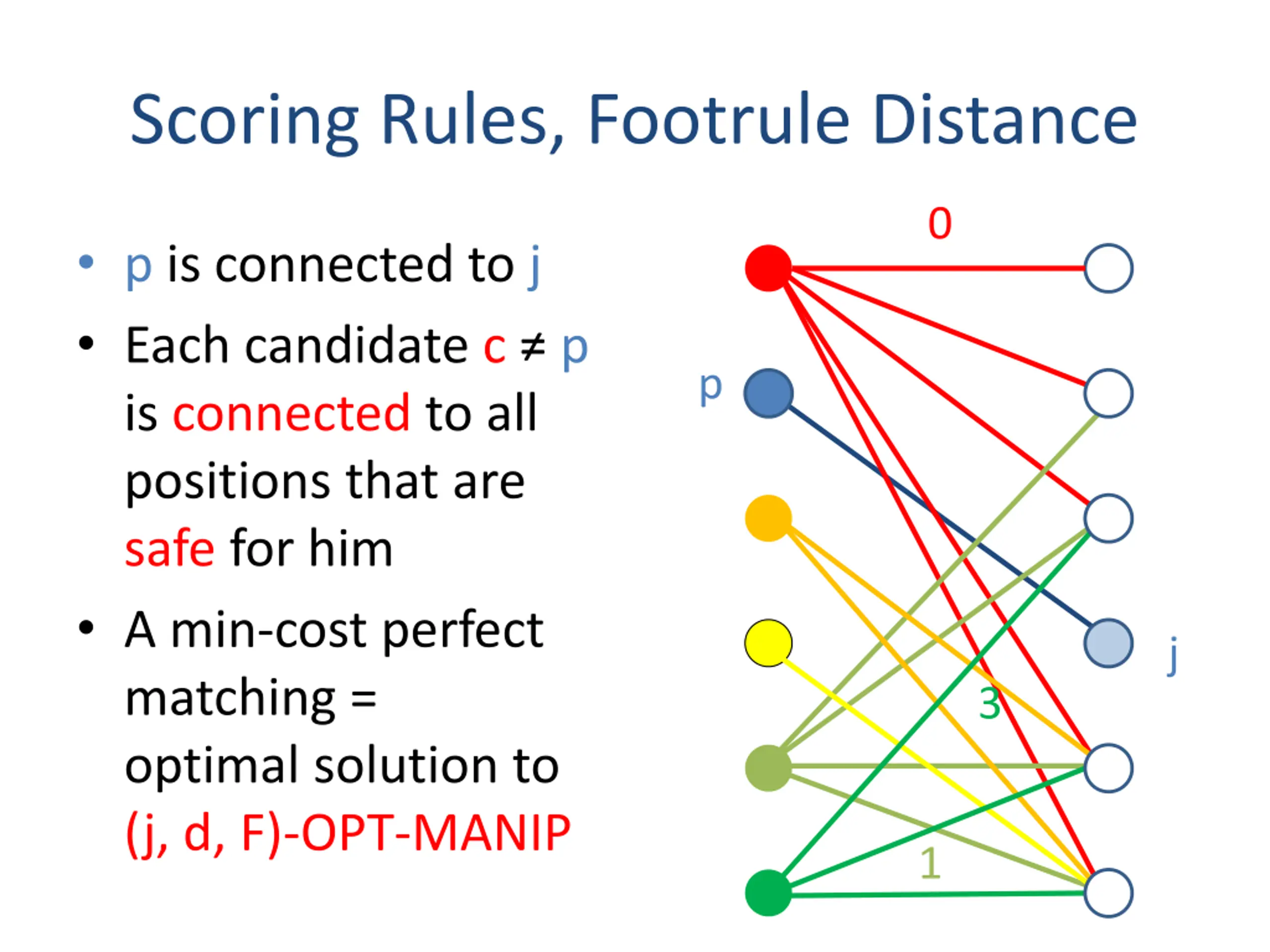 Scoring Rules, Footrule Distance 0 p is connected to j Each candidate c p is connected to all positions that are safe for him A min-cost perfect matching = optimal solution to (j, d, F)-OPT-MANIP p j 3 1