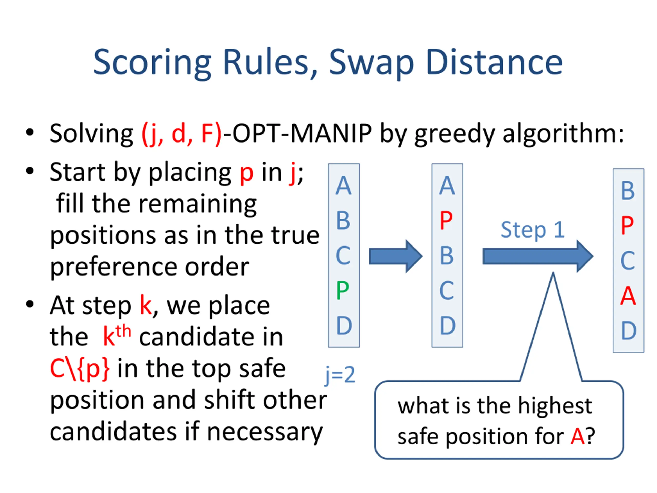 Scoring Rules, Swap Distance Solving (j, d, F)-OPT-MANIP by greedy algorithm: Start by placing p in j; fill the remaining positions as in the true preference order At step k, we place the kth candidate in C\{p} in the top safe position and shift other candidates if necessary A B C P D A P B C D B P C A D Step 1 j=2 what is the highest safe position for A?