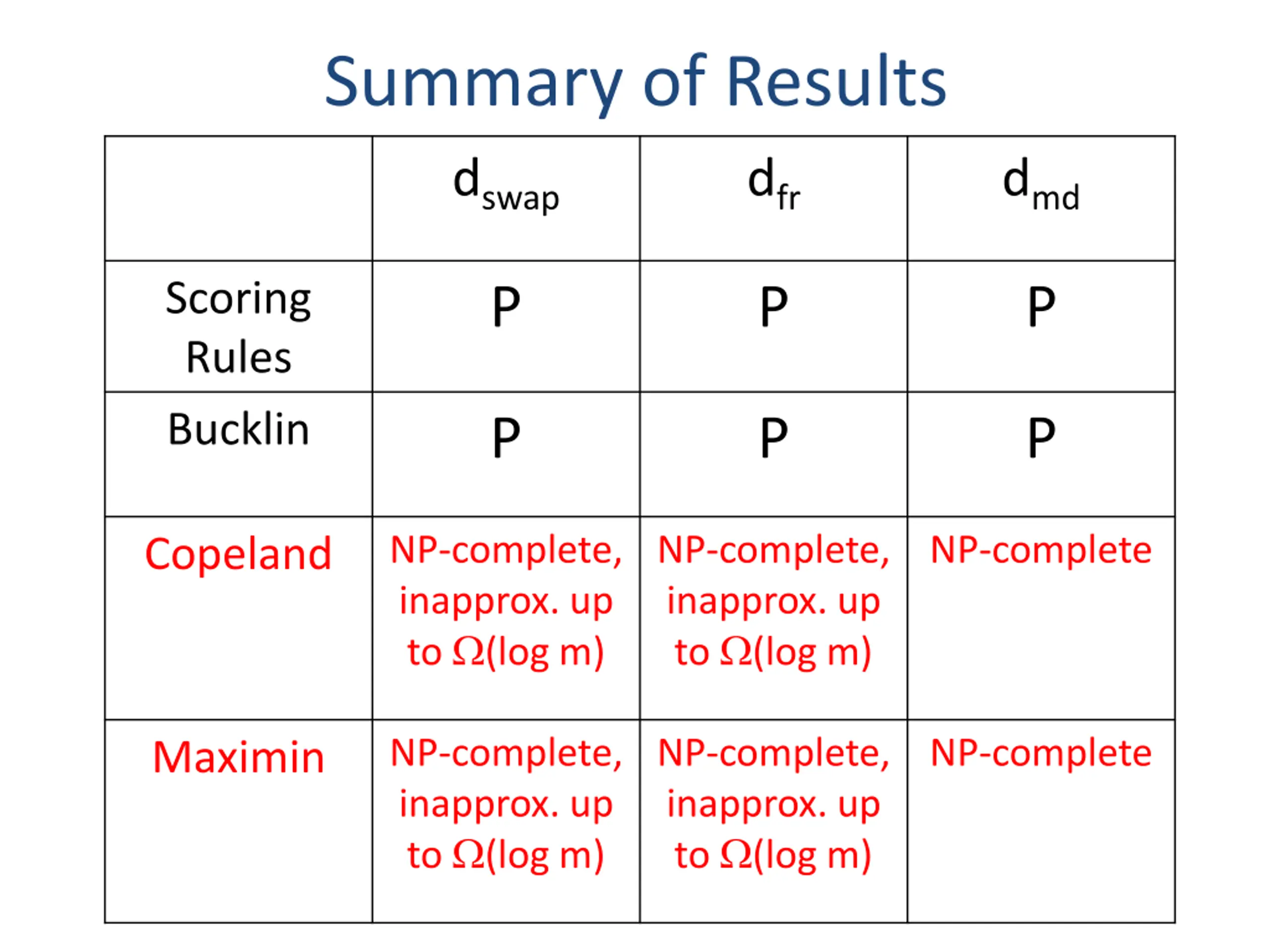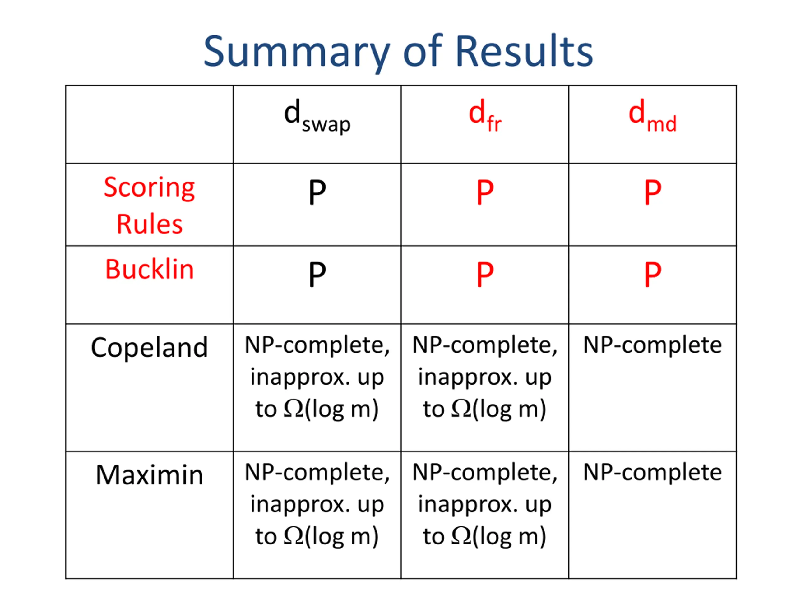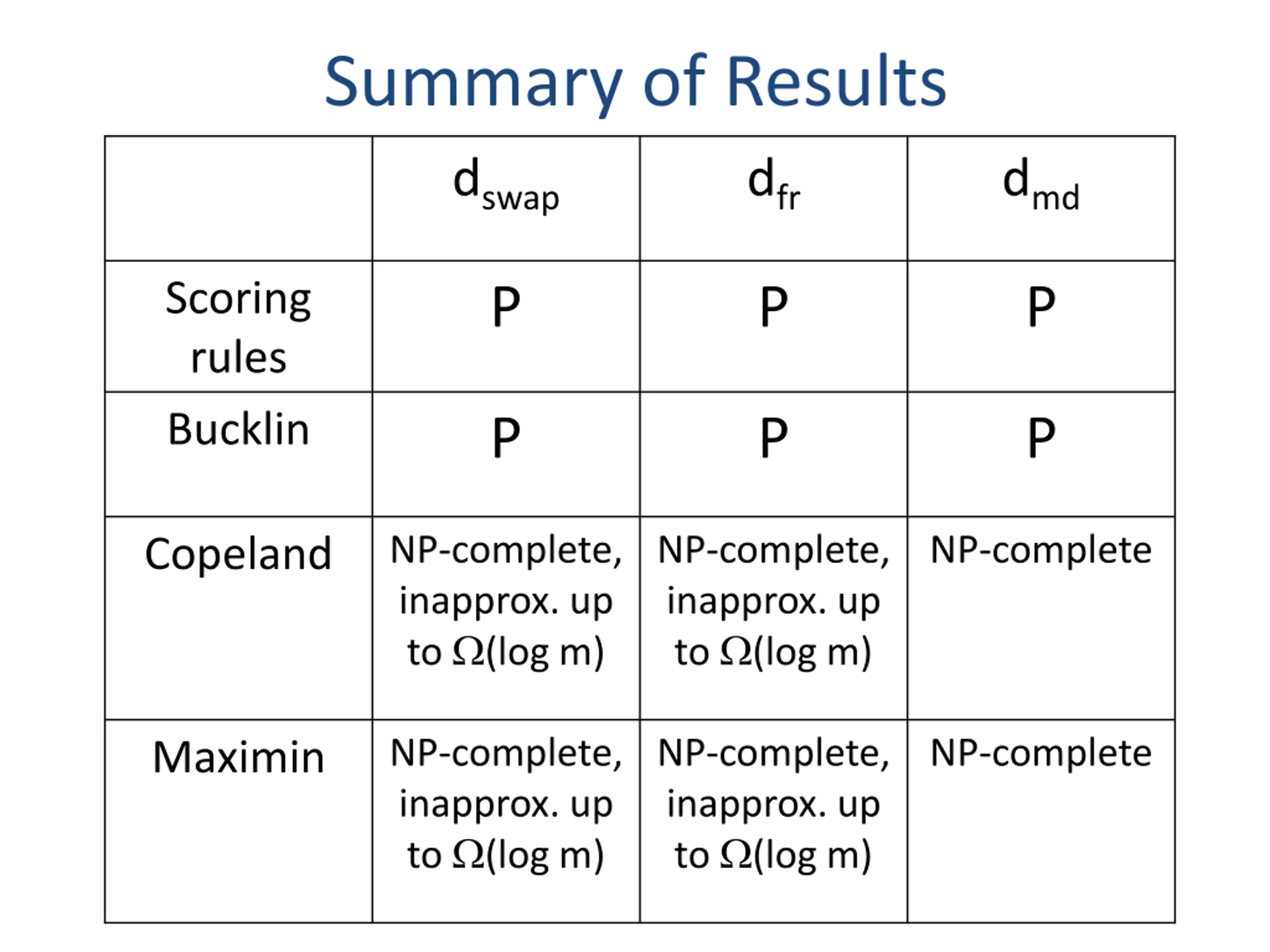 Summary of Results dswap dfr dmd Scoring Rules Bucklin P P P P P P NP-complete, inapprox. up to (log m) NP-complete, inapprox. up to (log m) NP-complete Copeland NP-complete, inapprox. up to (log m) NP-complete, inapprox. up to (log m) NP-complete Maximin