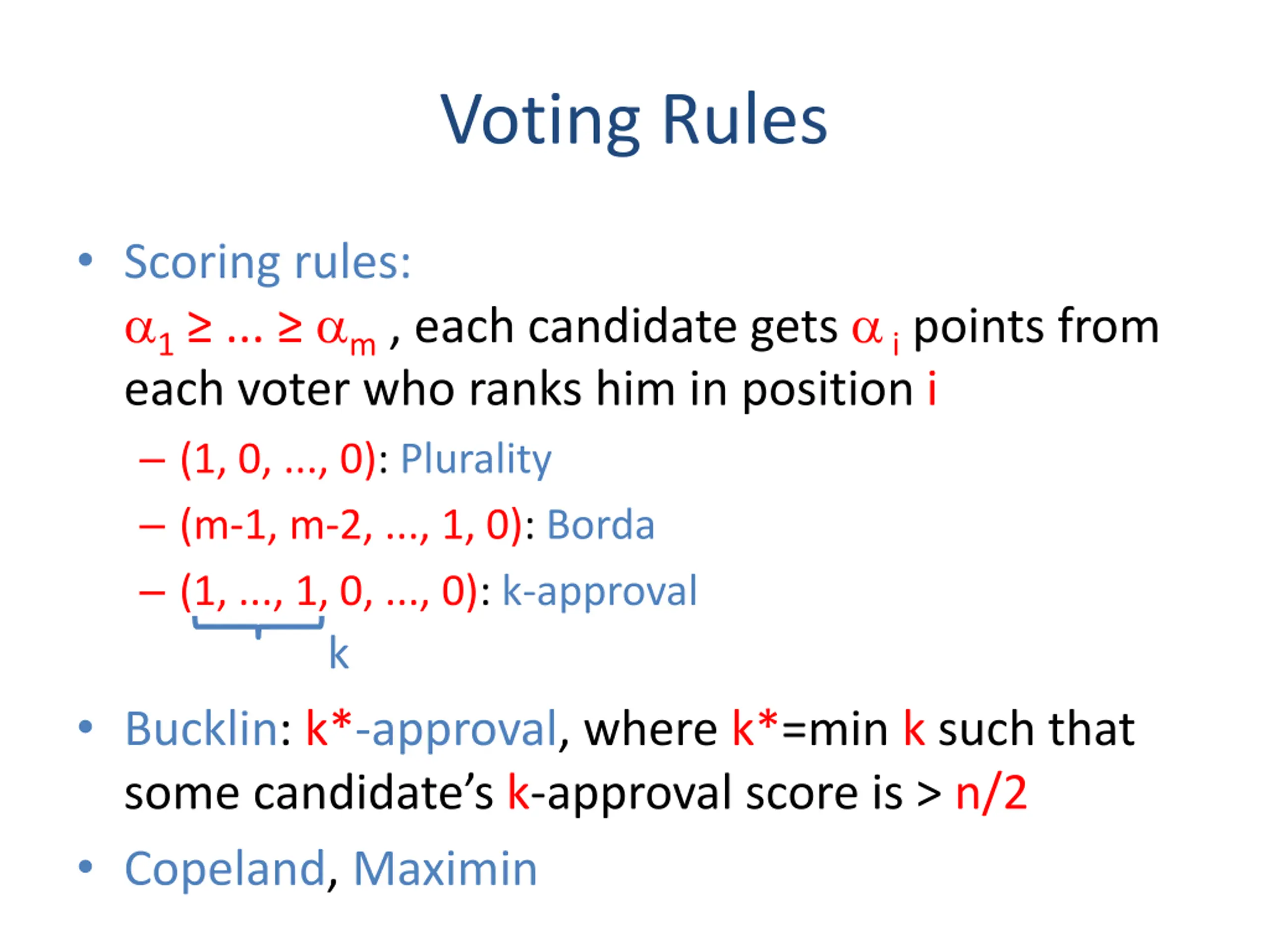 Voting Rules Scoring rules: 1 ... m , each candidate gets i points from each voter who ranks him in position i (1, 0, ..., 0): Plurality (m-1, m-2, ..., 1, 0): Borda (1, ..., 1, 0, ..., 0): k-approval k Bucklin: k*-approval, where k*=min k such that some candidate s k-approval score is > n/2 Copeland, Maximin