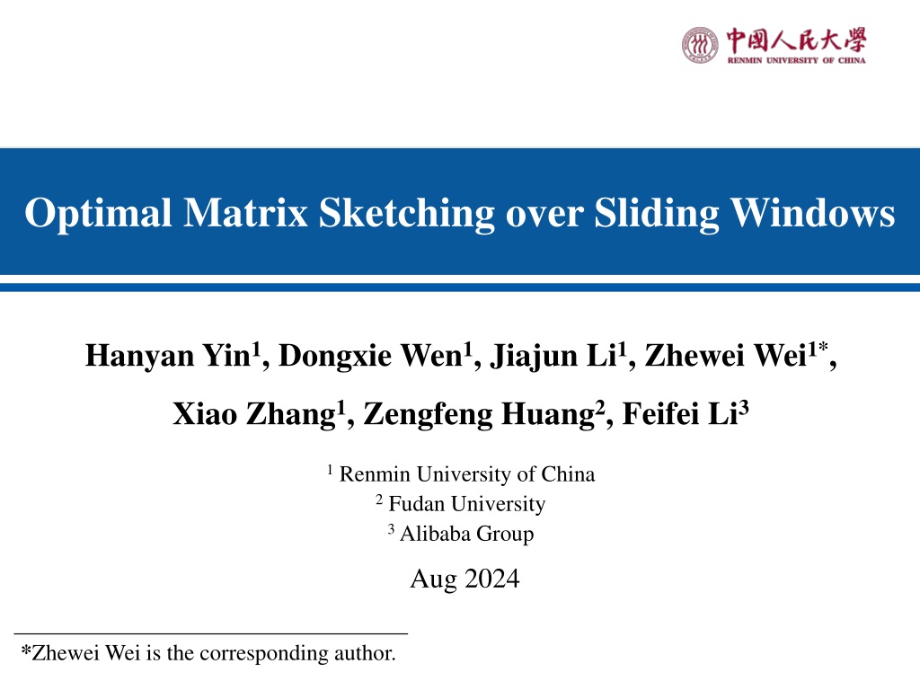 Optimal Matrix Sketching over Sliding Windows Hanyan Yin1, Dongxie Wen1, Jiajun Li1, Zhewei Wei1*, Xiao Zhang1, Zengfeng Huang2, Feifei Li3 1Renmin University of China 2Fudan University 3Alibaba Group Aug 2024 *Zhewei Wei is the corresponding author. 0