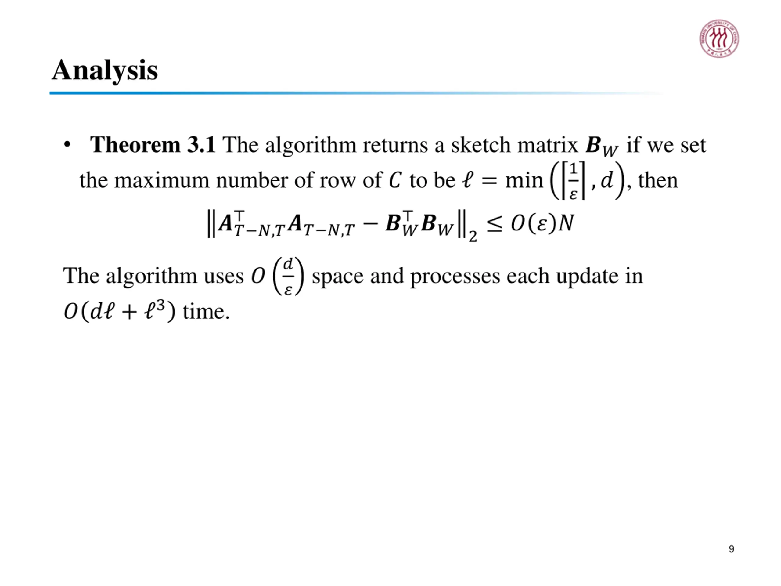 Analysis Theorem 3.1 The algorithm returns a sketch matrix ??if we set the maximum number of row of ? to be = min 1 ?,? , then ??2 ? ? ? ?? ?,? ?? ?,? ?? ? ? The algorithm uses ? ? ? + 3time. space and processes each update in 9