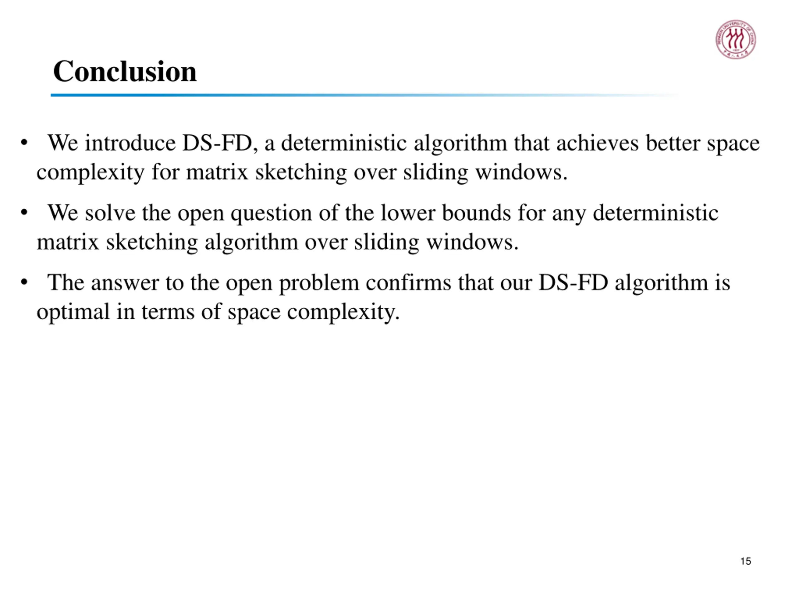 Conclusion We introduce DS-FD, a deterministic algorithm that achieves better space complexity for matrix sketching over sliding windows. We solve the open question of the lower bounds for any deterministic matrix sketching algorithm over sliding windows. The answer to the open problem confirms that our DS-FD algorithm is optimal in terms of space complexity. 15