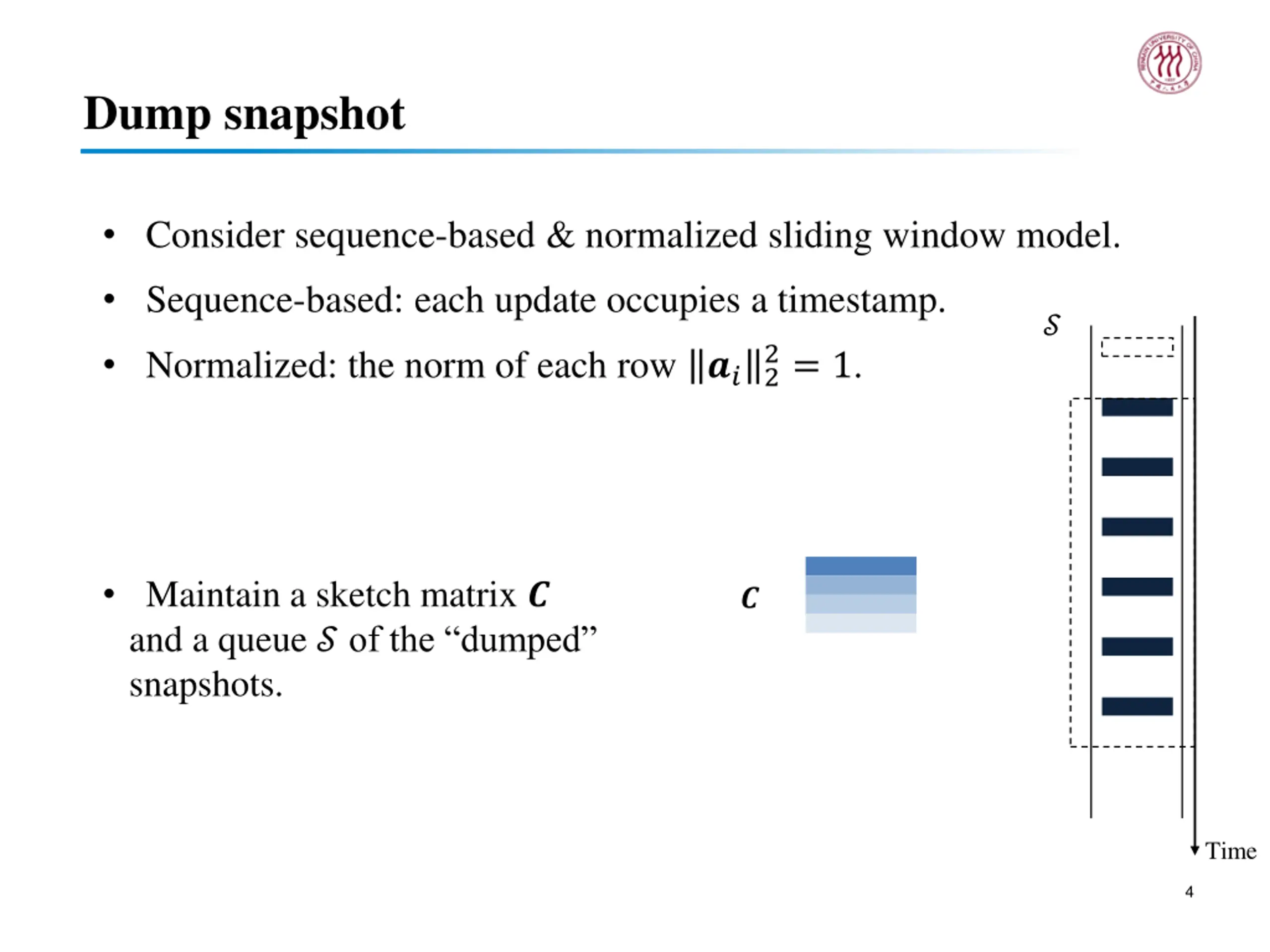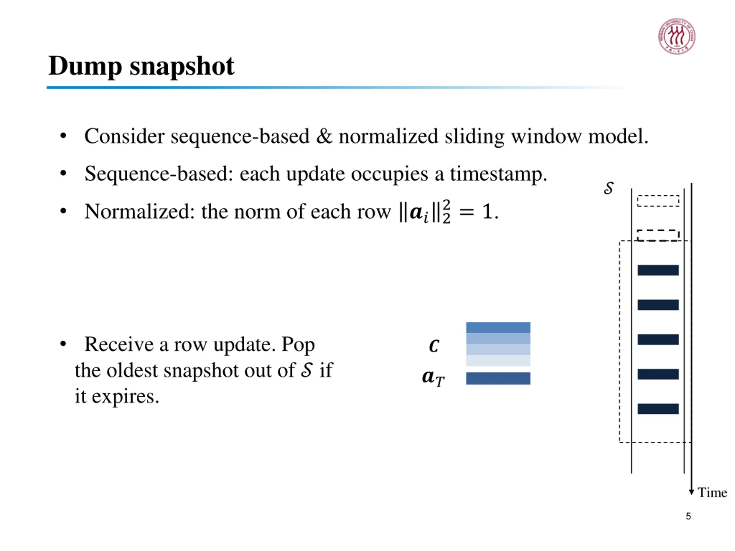 Dump snapshot Consider sequence-based & normalized sliding window model. Sequence-based: each update occupies a timestamp. ? 2= 1. Normalized: the norm of each row ?? 2 Maintain a sketch matrix ? and a queue ? of the dumped snapshots. ? Time 4