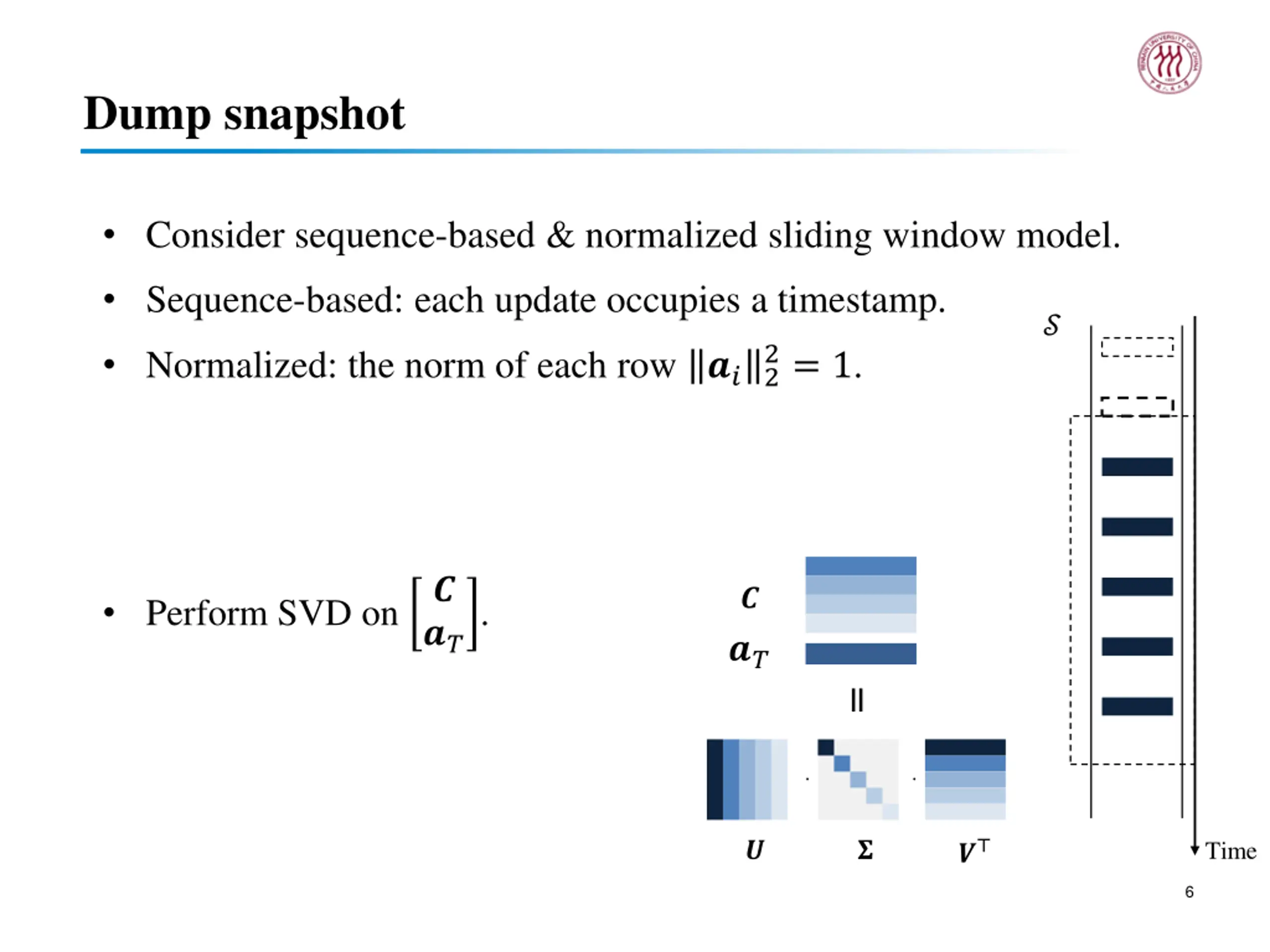 Dump snapshot Consider sequence-based & normalized sliding window model. Sequence-based: each update occupies a timestamp. ? 2= 1. Normalized: the norm of each row ?? 2 Receive a row update. Pop the oldest snapshot out of ? if it expires. ? ?? Time 5