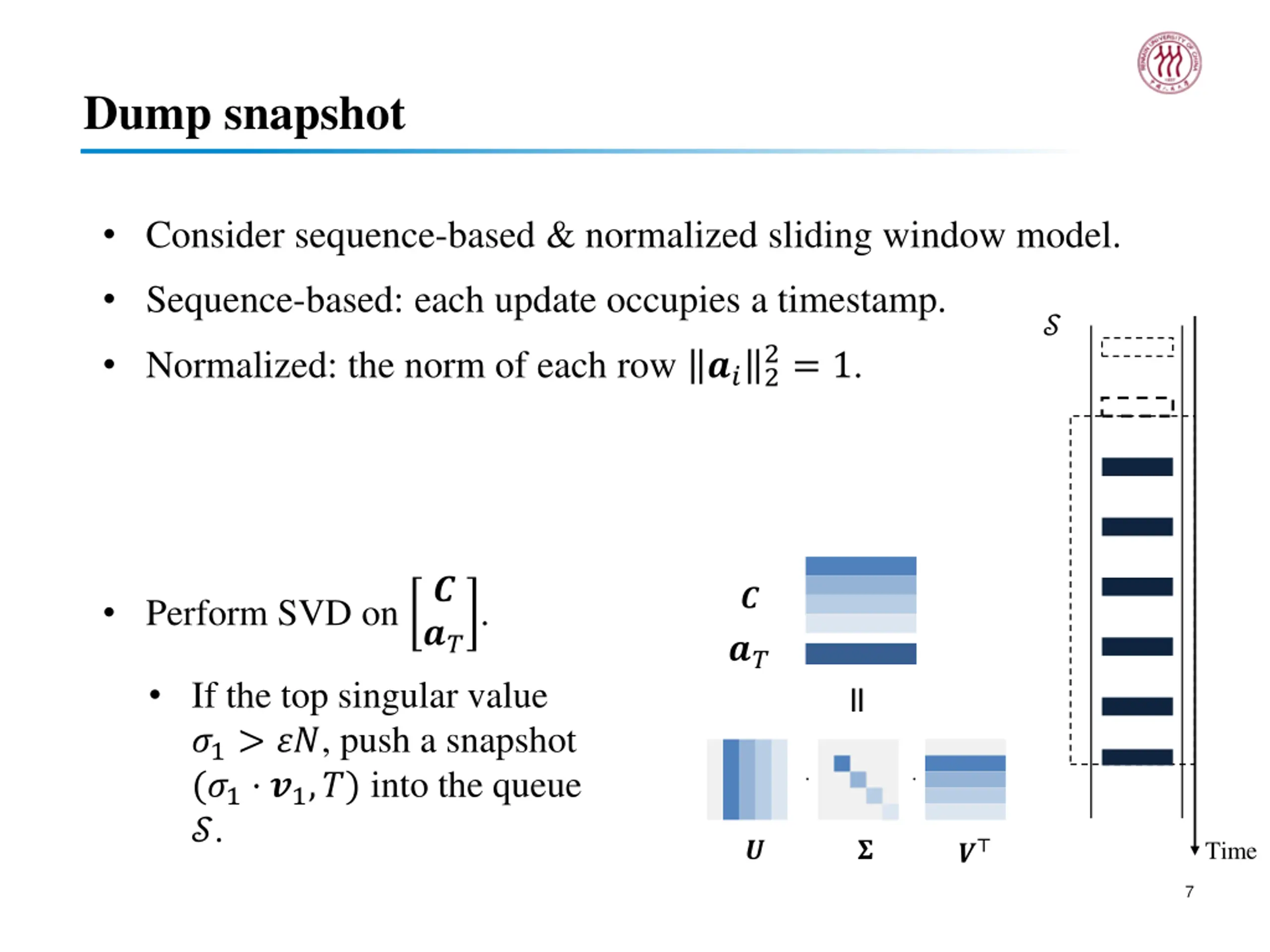 Dump snapshot Consider sequence-based & normalized sliding window model. Sequence-based: each update occupies a timestamp. ? 2= 1. Normalized: the norm of each row ?? 2 ? ??. ? Perform SVD on ?? = ? Time ? ? 6