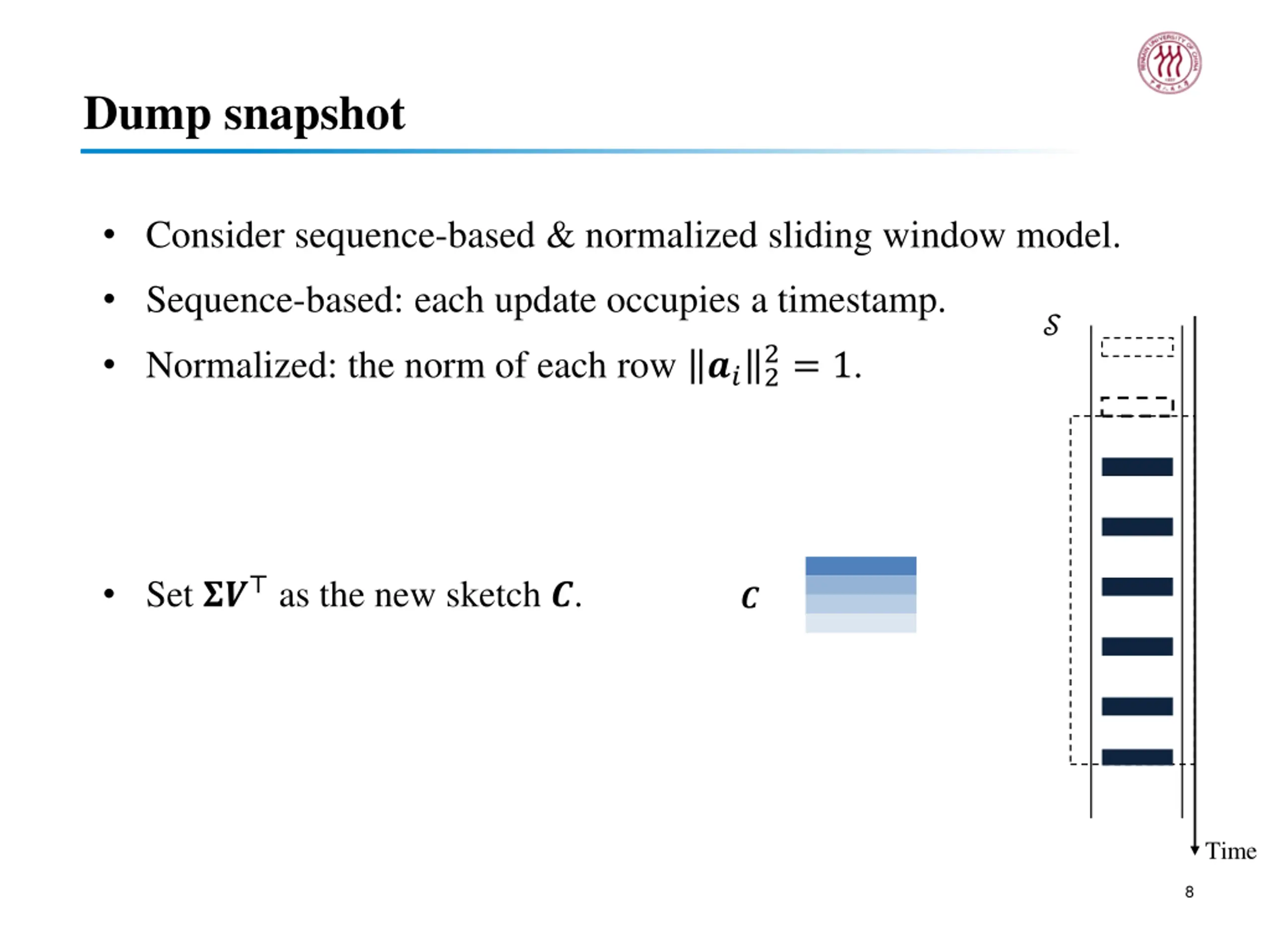 Dump snapshot Consider sequence-based & normalized sliding window model. Sequence-based: each update occupies a timestamp. ? 2= 1. Normalized: the norm of each row ?? 2 ? ??. ? Perform SVD on ?? If the top singular value ?1> ??, push a snapshot (?1 ?1,?) into the queue ?. = ? Time ? ? 7