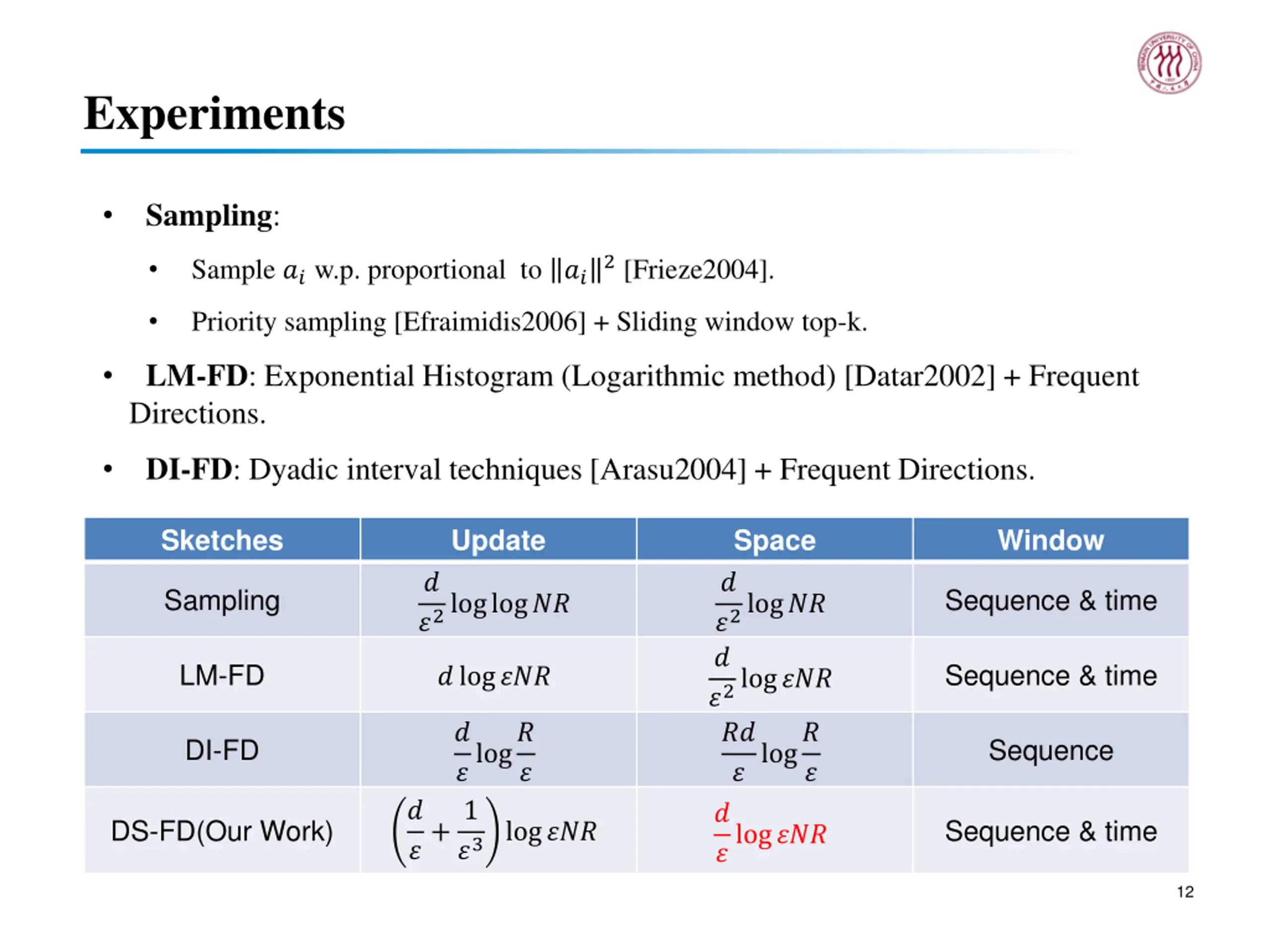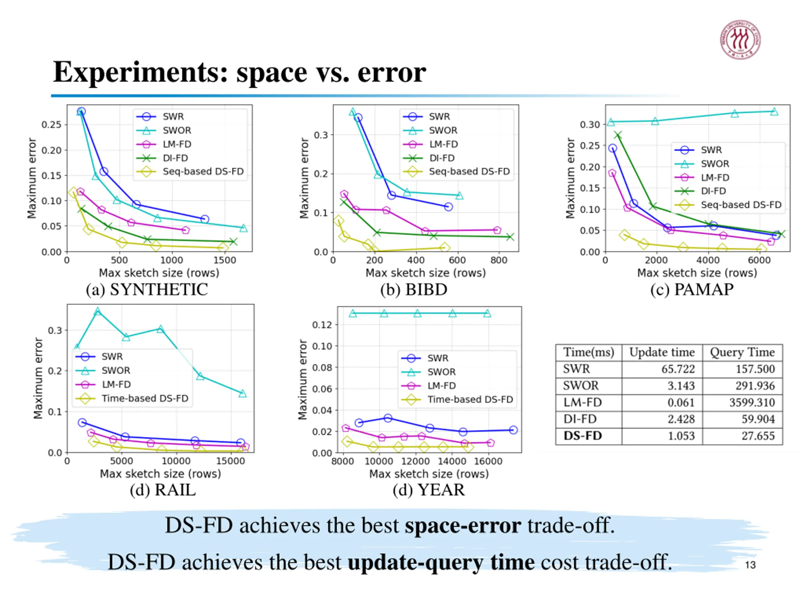 Experiments Sampling: 2[Frieze2004]. Sample ?? w.p. proportional to ?? Priority sampling [Efraimidis2006] + Sliding window top-k. LM-FD: Exponential Histogram (Logarithmic method) [Datar2002] + Frequent Directions. DI-FD: Dyadic interval techniques [Arasu2004] + Frequent Directions. Sketches Update Space ? ?2log?? ? ?2log??? ?? ?log? ? ?log??? Window ? ?2loglog?? Sampling Sequence & time LM-FD Sequence & time ?log??? ? ?log? DI-FD Sequence ? ? ? ?+1 DS-FD(Our Work) Sequence & time ?3log??? 12