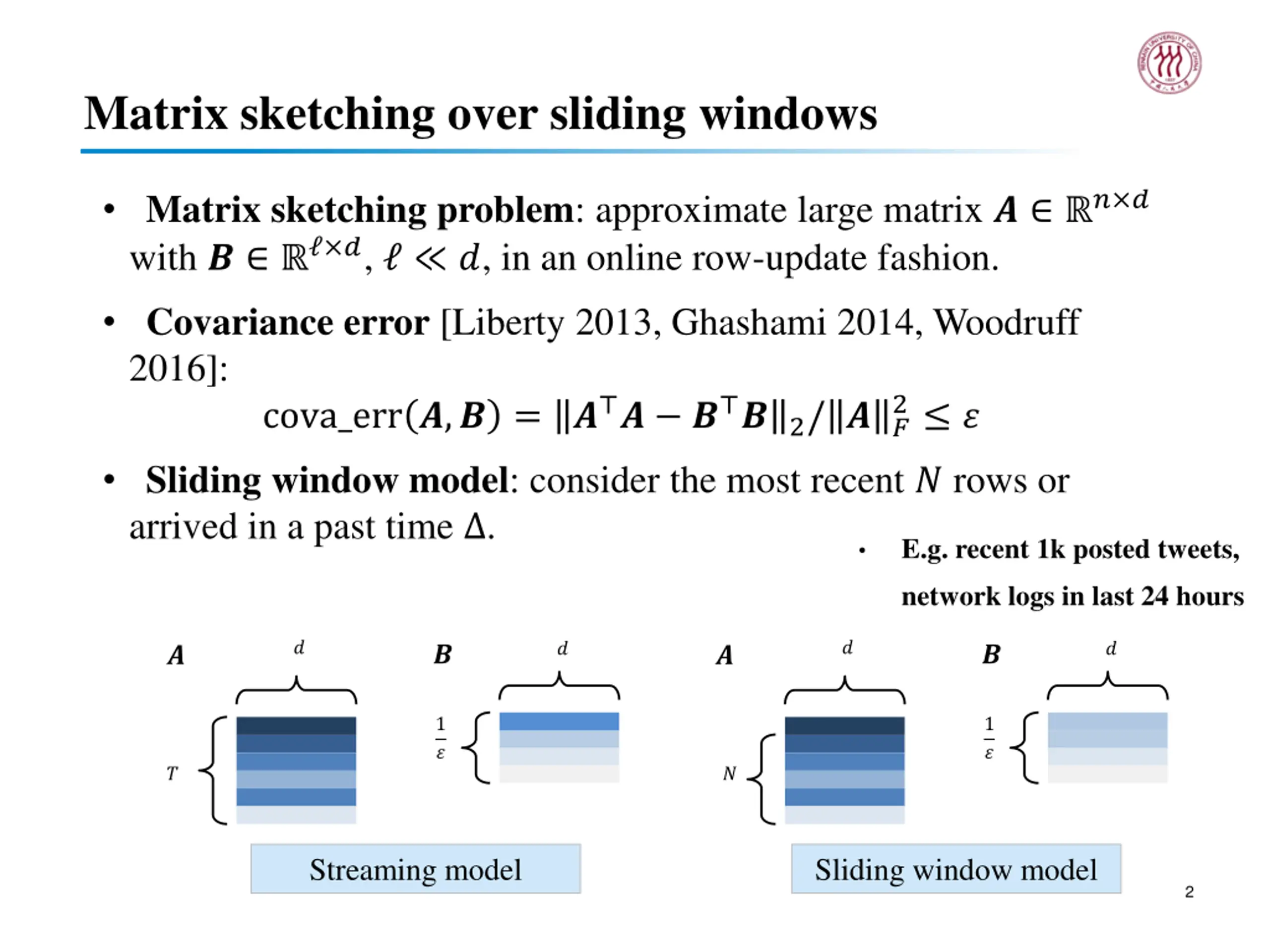 Matrix sketching over sliding windows Matrix sketching problem: approximate large matrix ? ? ? with ? ?, ?, in an online row-update fashion. Covariance error [Liberty 2013, Ghashami 2014, Woodruff 2016]: cova_err ?,? = ? ? ? ?2/ ?? Sliding window model: consider the most recent ? rows or arrived in a past time . 2 ? E.g. recent 1k posted tweets, network logs in last 24 hours ? ? ? ? ? ? ? ? 1 ? 1 ? ? ? Streaming model Sliding window model 2
