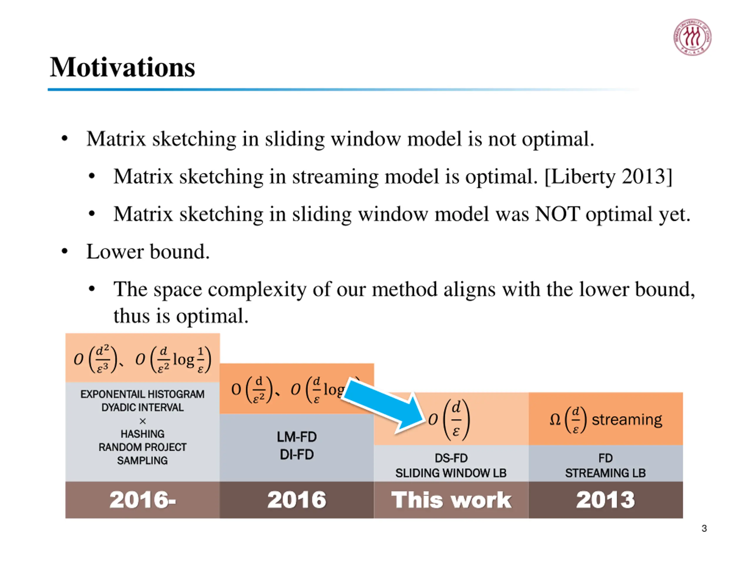 Motivations Matrix sketching in sliding window model is not optimal. Matrix sketching in streaming model is optimal. [Liberty 2013] Matrix sketching in sliding window model was NOT optimal yet. Lower bound. The space complexity of our method aligns with the lower bound, thus is optimal. ?2 ?3 ? ? ?2log1 ? ? d ?2 ? ? ?log1 O EXPONENTAIL HISTOGRAM EXPONENTAIL HISTOGRAM DYADIC INTERVAL DYADIC INTERVAL HASHING HASHING RANDOM PROJECT RANDOM PROJECT SAMPLING SAMPLING ? ? ? ? ? streaming ? LM LM- -FD DI DI- -FD FD FD DS DS- -FD FD FD FD SLIDING WINDOW LB SLIDING WINDOW LB This work This work STREAMING LB STREAMING LB 2013 2013 2016 2016- - 2016 2016 3