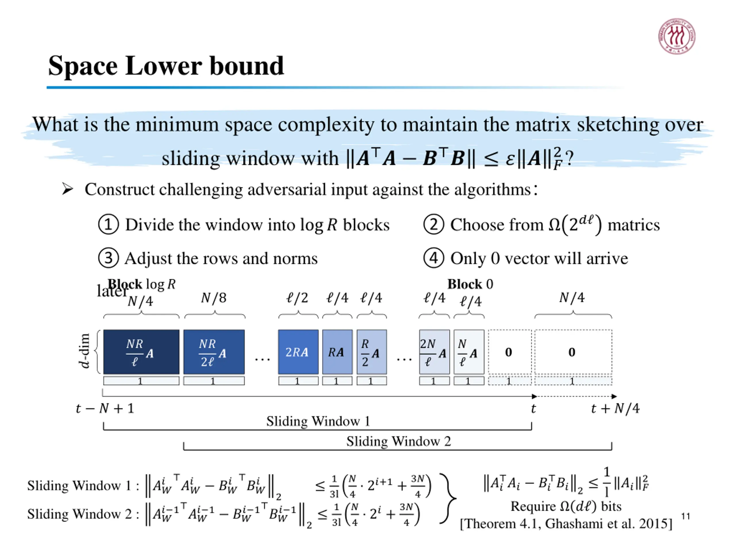 Space Lower bound What is the minimum space complexity to maintain the matrix sketching over sliding window with ? ? ? ? ? ?? Construct challenging adversarial input against the algorithms 2? Choose from 2? matrics Divide the window into log? blocks Adjust the rows and norms Only 0 vector will arrive Block log? ?/4 Block 0 /4 later ?/4 ?/8 /2 /4 /4 /4 ?-dim ?? ?? 2 ? ? ? ? 2? 2? ? 2?? ?? ? ? ? 1 1 1 1 1 1 1 1 1 ? ? + 1 ? ? + ?/4 Sliding Window 1 Sliding Window 2 2 1 ? ?? ? 1 ?? ? ?? ? 1 ?? ?? ?? Require ? bits [Theorem 4.1, Ghashami et al. 2015] ?? 2 1 3l 1 3l ? 4 2?+1+3? ? 4 2?+3? ?? ?? ? ? ?? ? Sliding Window 1 : ?? l 4 2 ? 1 ? 1 ?? Sliding Window 2 : ?? 2 11 4