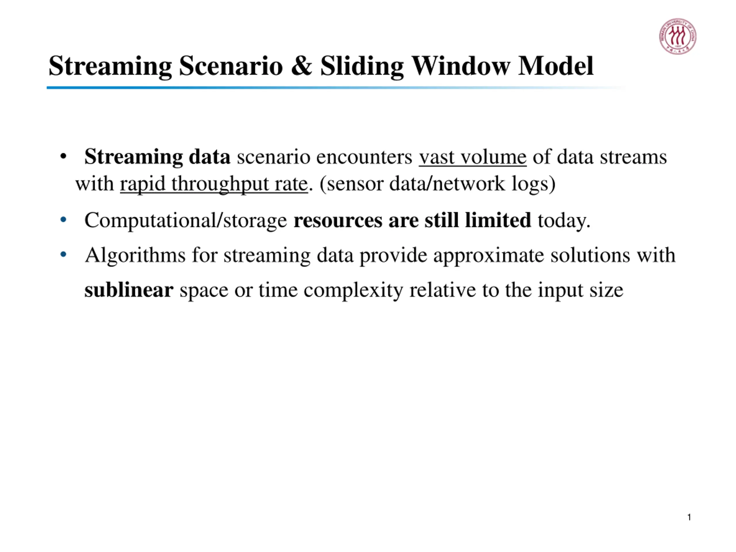 Streaming Scenario & Sliding Window Model Streaming data scenario encounters vast volume of data streams with rapid throughput rate. (sensor data/network logs) Computational/storage resources are still limited today. Algorithms for streaming data provide approximate solutions with sublinear space or time complexity relative to the input size 1