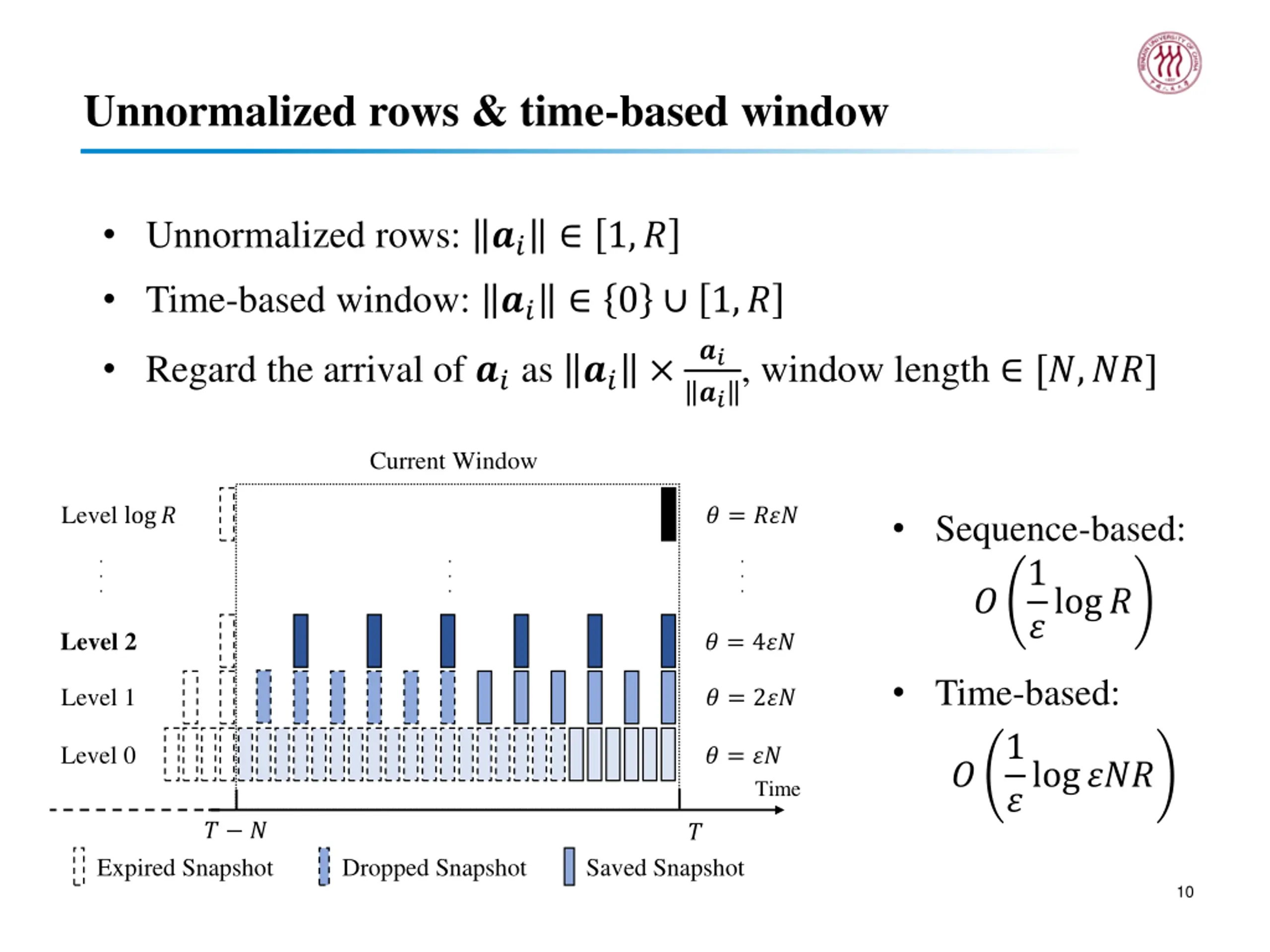 Unnormalized rows & time-based window Unnormalized rows: ?? 1,? Time-based window: ?? 0 1,? ?? ??, window length [?,??] Regard the arrival of ??as ?? Current Window Level log? ? = ??? Sequence-based: 1 ?log? . . . . . . . . . ? Level 2 ? = 4?? Time-based: 1 ?log??? Level 1 ? = 2?? Level 0 ? = ?? ? Time ? ? ? Expired Snapshot Dropped Snapshot Saved Snapshot 10