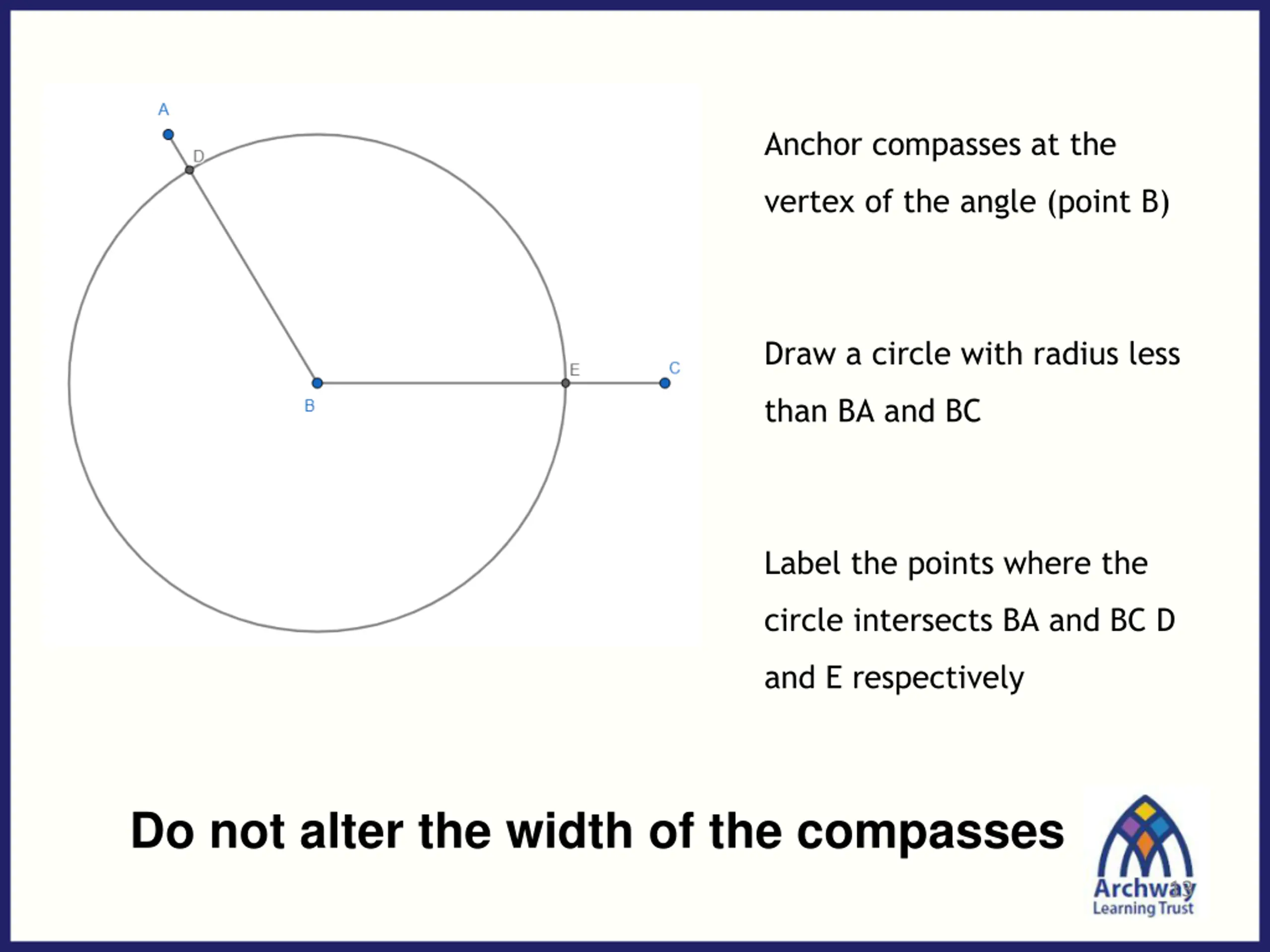 Anchor compasses at the vertex of the angle (point B) Draw a circle with radius less than BA and BC Label the points where the circle intersects BA and BC D and E respectively Do not alter the width of the compasses 13