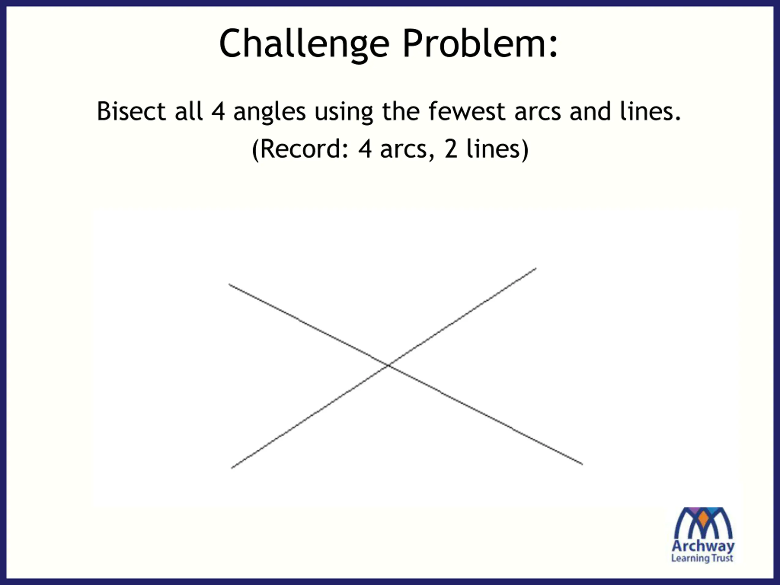 Challenge Problem: Bisect all 4 angles using the fewest arcs and lines. (Record: 4 arcs, 2 lines)
