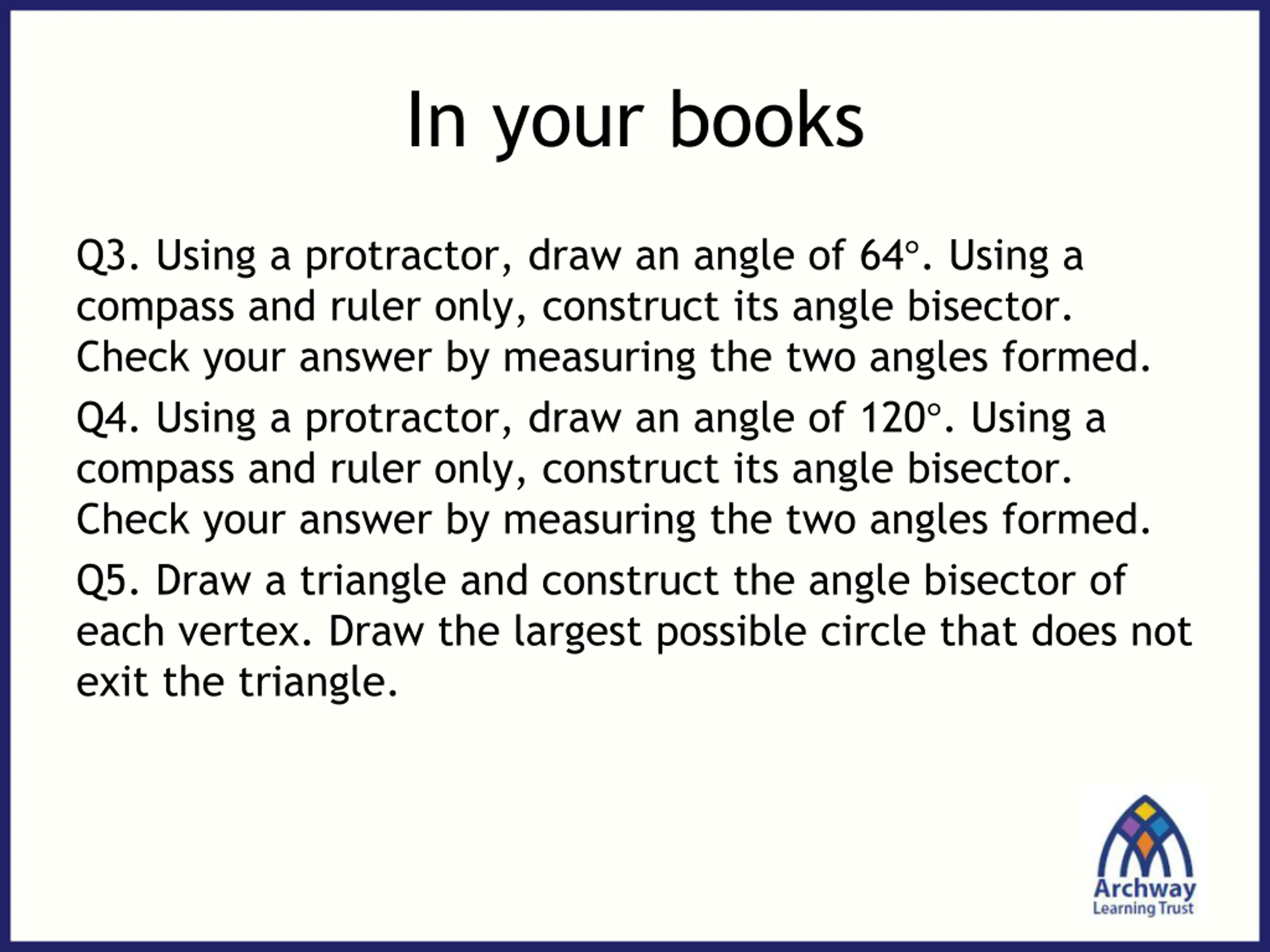 In your books Q3. Using a protractor, draw an angle of 64 . Using a compass and ruler only, construct its angle bisector. Check your answer by measuring the two angles formed. Q4. Using a protractor, draw an angle of 120 . Using a compass and ruler only, construct its angle bisector. Check your answer by measuring the two angles formed. Q5. Draw a triangle and construct the angle bisector of each vertex. Draw the largest possible circle that does not exit the triangle.