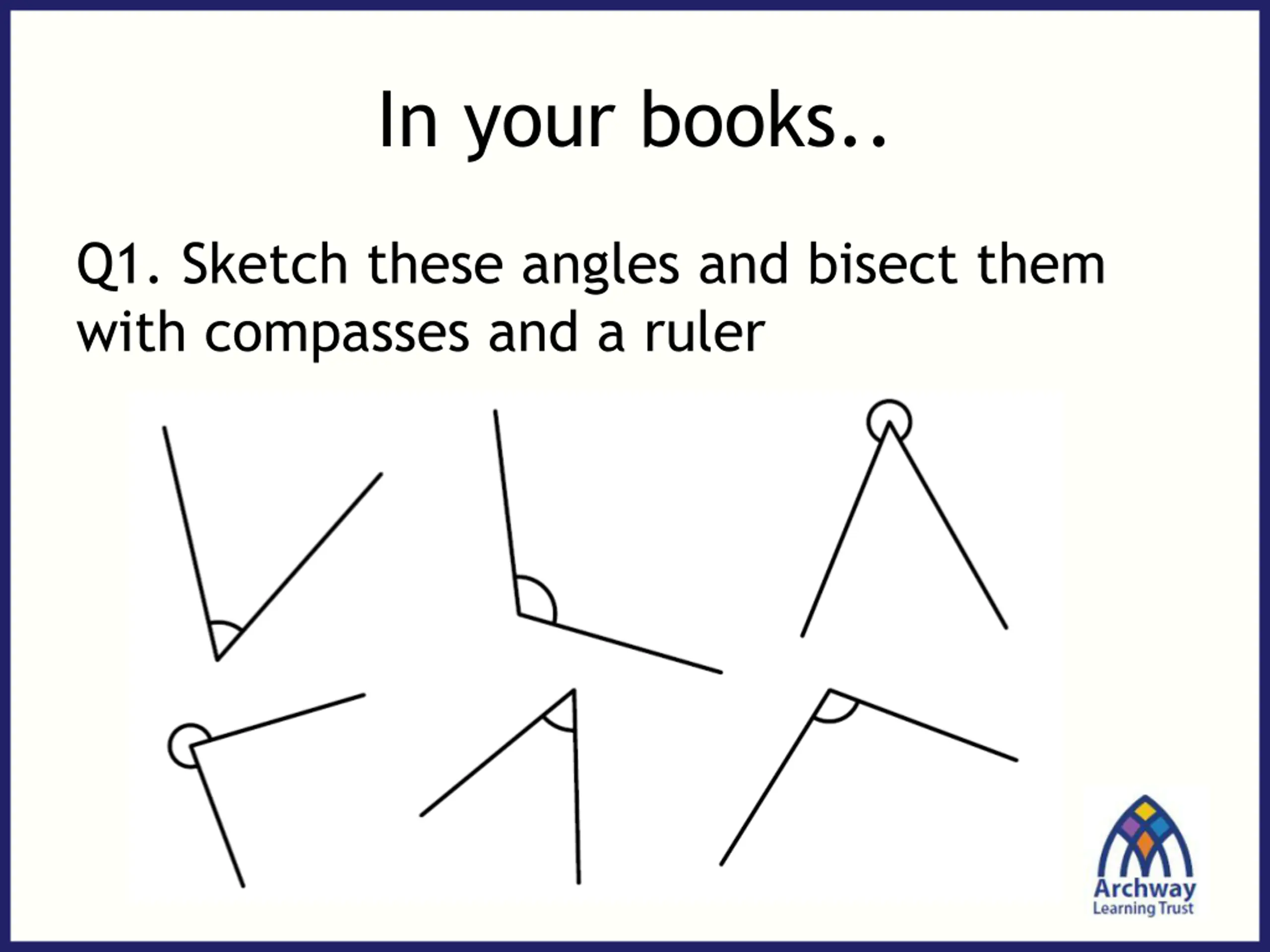 In your books.. Q1. Sketch these angles and bisect them with compasses and a ruler