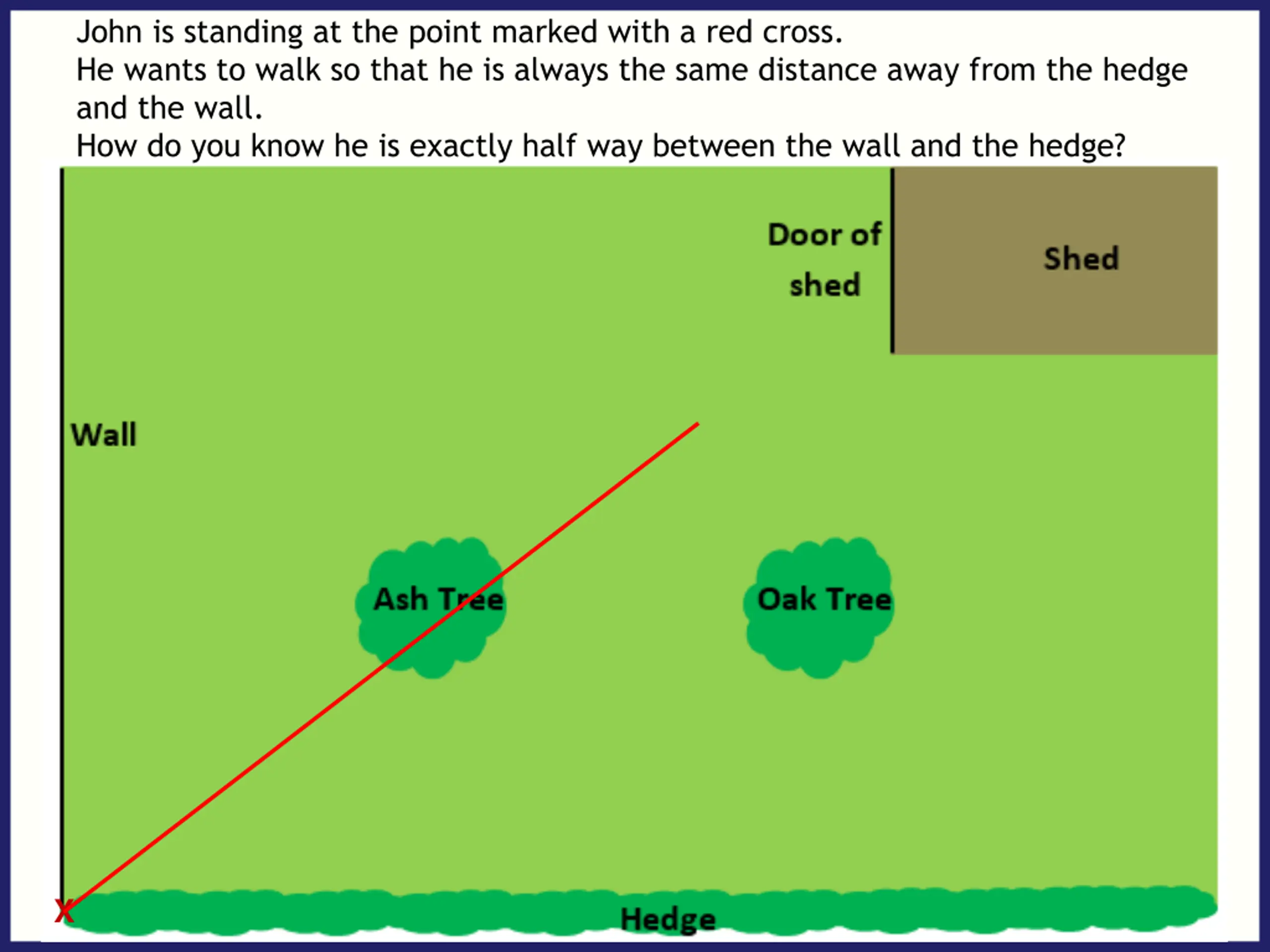 John is standing at the point marked with a red cross. He wants to walk so that he is always the same distance away from the hedge and the wall. How do you know he is exactly half way between the wall and the hedge? X