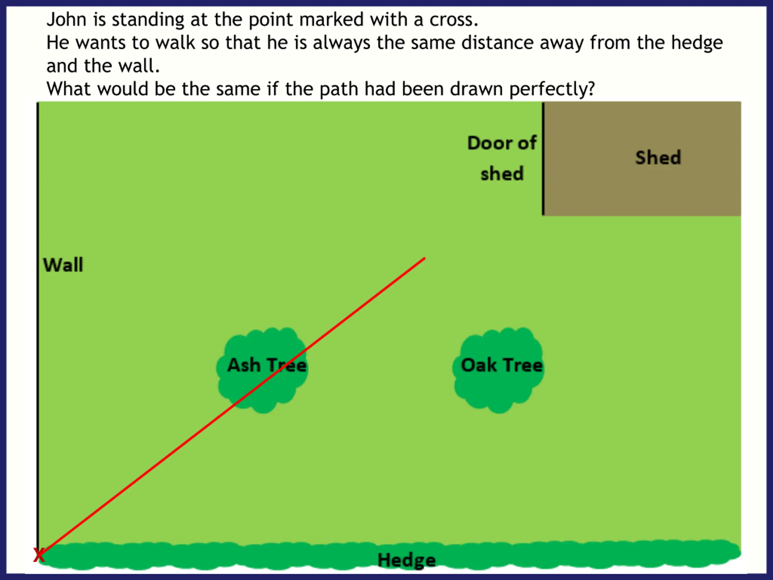 John is standing at the point marked with a cross. He wants to walk so that he is always the same distance away from the hedge and the wall. What would be the same if the path had been drawn perfectly? X