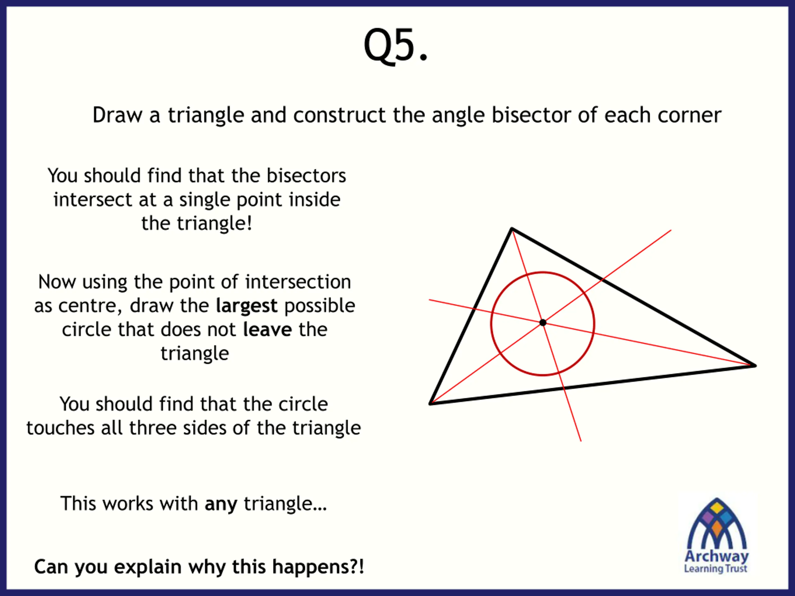 Q5. Draw a triangle and construct the angle bisector of each corner You should find that the bisectors intersect at a single point inside the triangle! Now using the point of intersection as centre, draw the largest possible circle that does not leave the triangle You should find that the circle touches all three sides of the triangle This works with anytriangle Can you explain why this happens?!