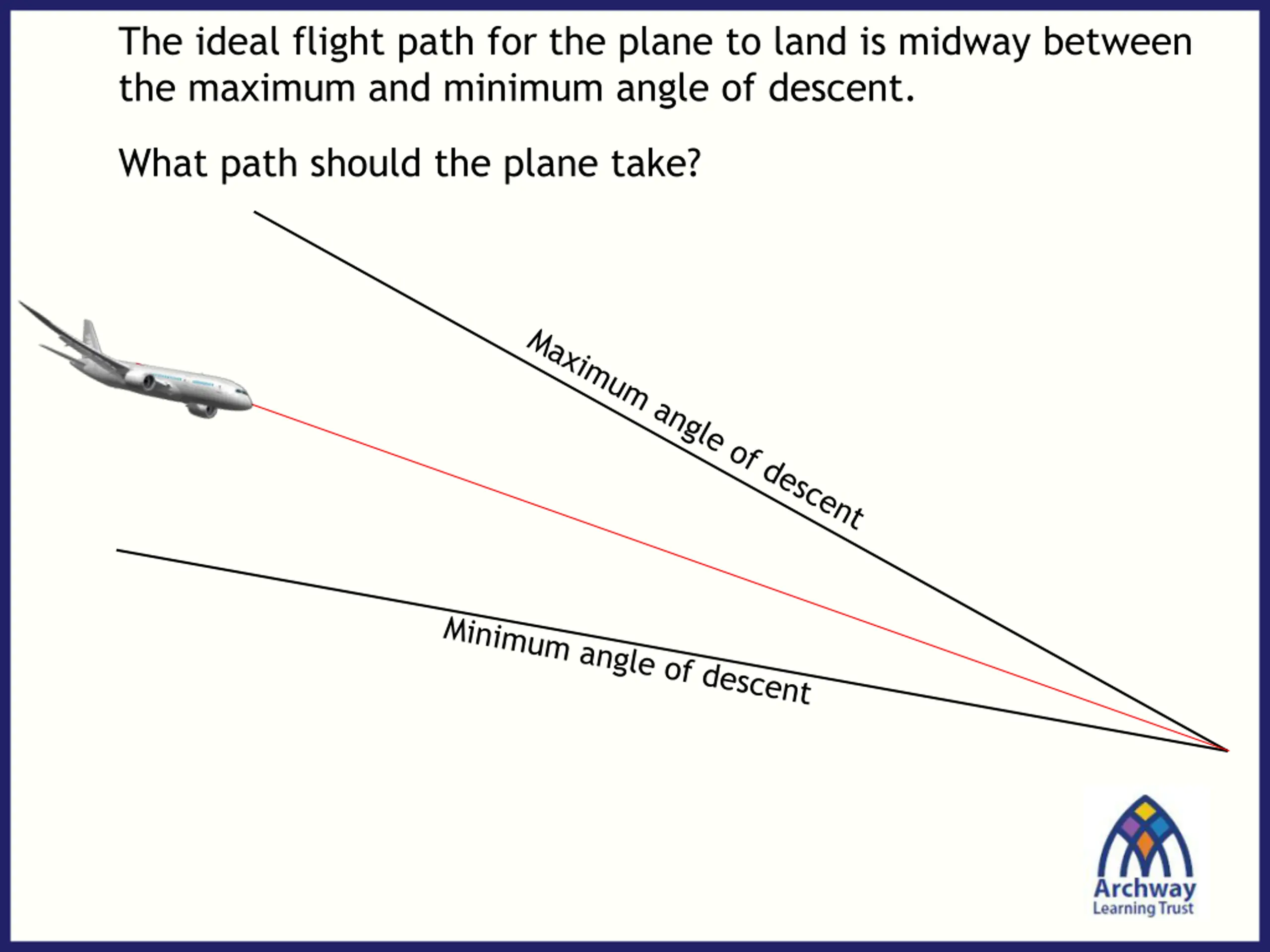 The ideal flight path for the plane to land is midway between the maximum and minimum angle of descent. What path should the plane take?
