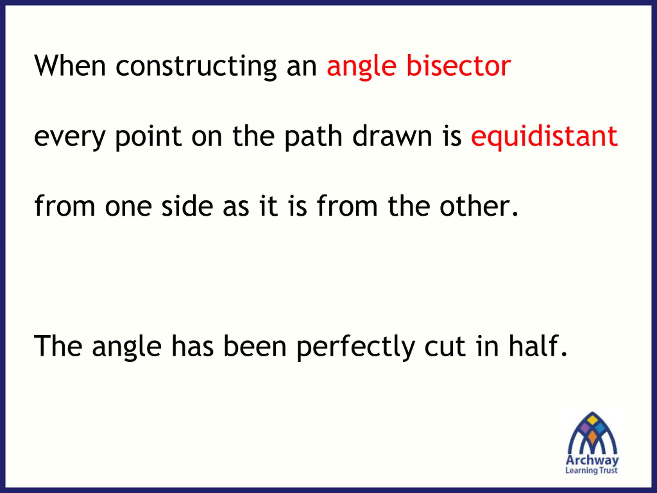 When constructing an angle bisector every point on the path drawn is equidistant from one side as it is from the other. The angle has been perfectly cut in half.