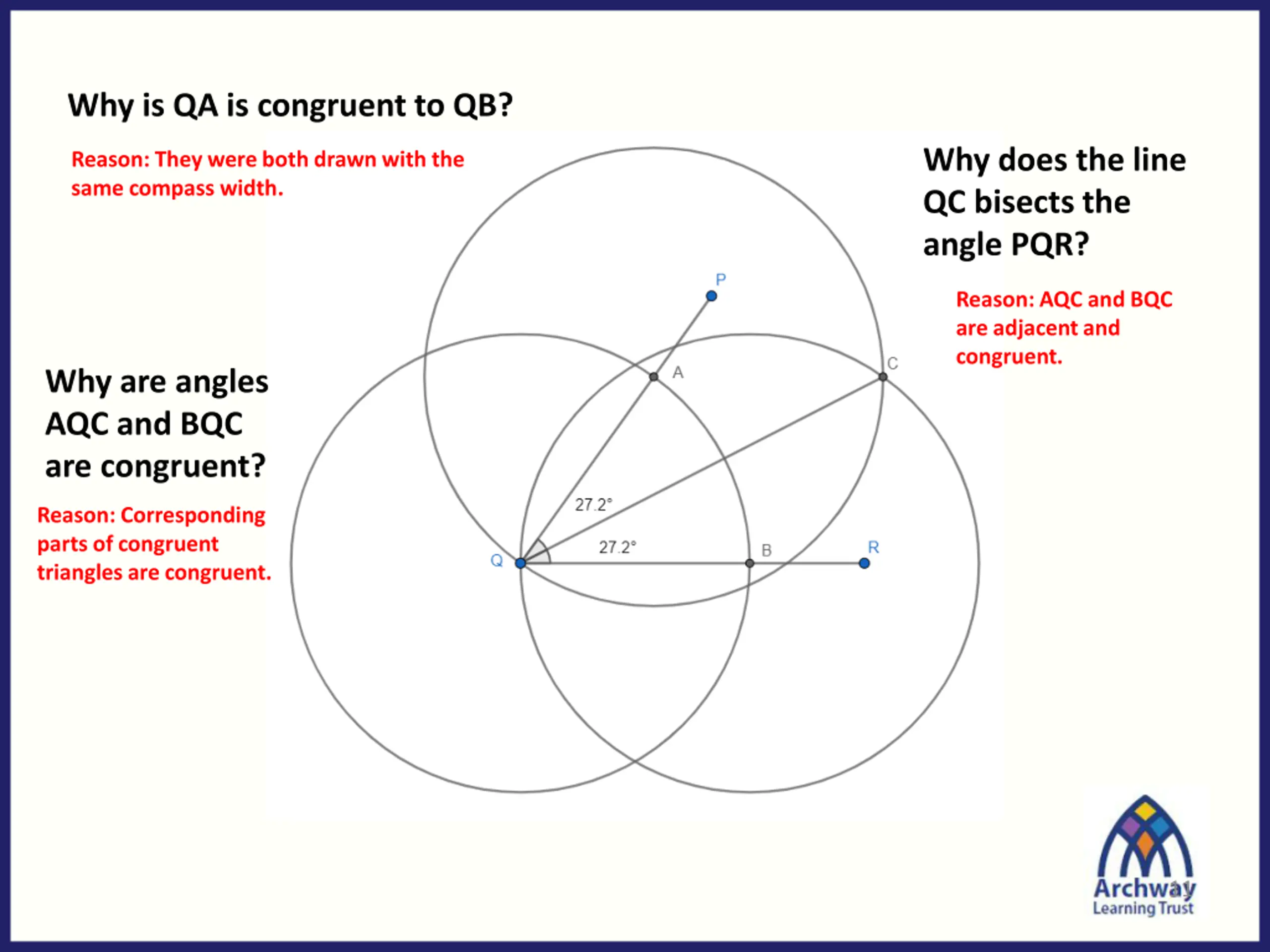 Why is QA is congruent to QB? Why does the line QC bisects the angle PQR? Reason: They were both drawn with the same compass width. Reason: AQC and BQC are adjacent and congruent. Why are angles AQC and BQC are congruent? Reason: Corresponding parts of congruent triangles are congruent. 11