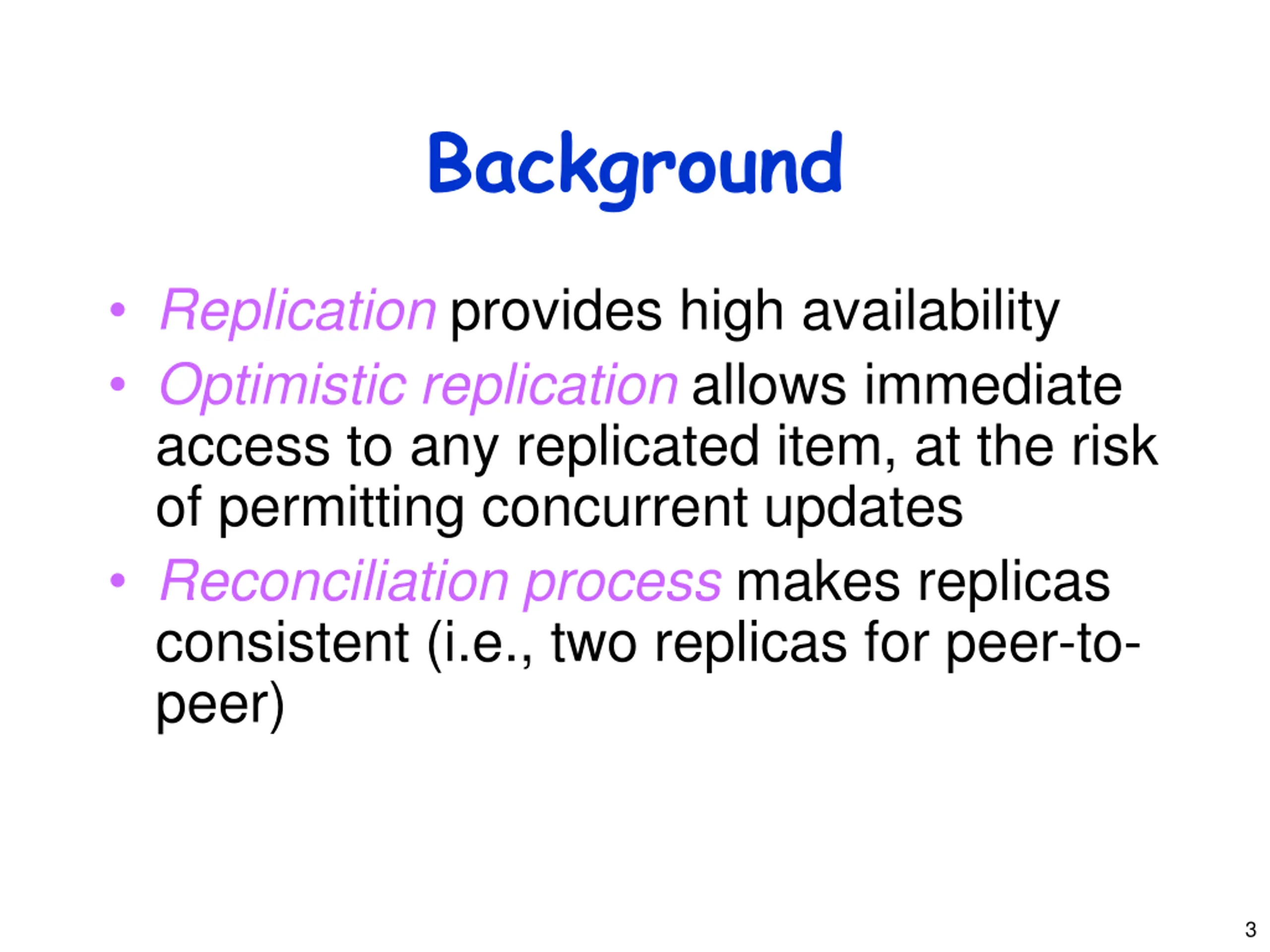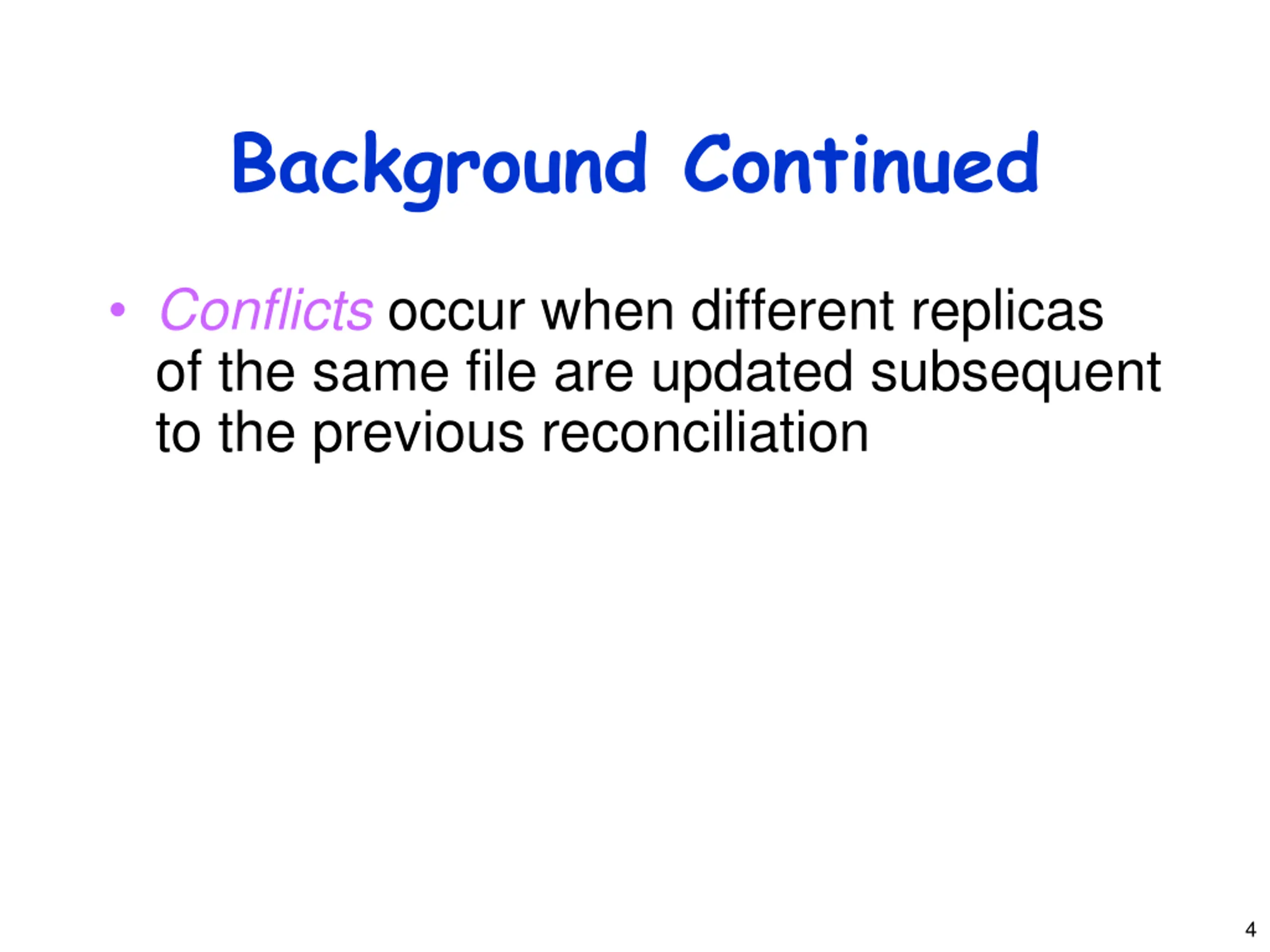 Background Replication provides high availability Optimistic replication allows immediate access to any replicated item, at the risk of permitting concurrent updates Reconciliation process makes replicas consistent (i.e., two replicas for peer-to- peer) 3