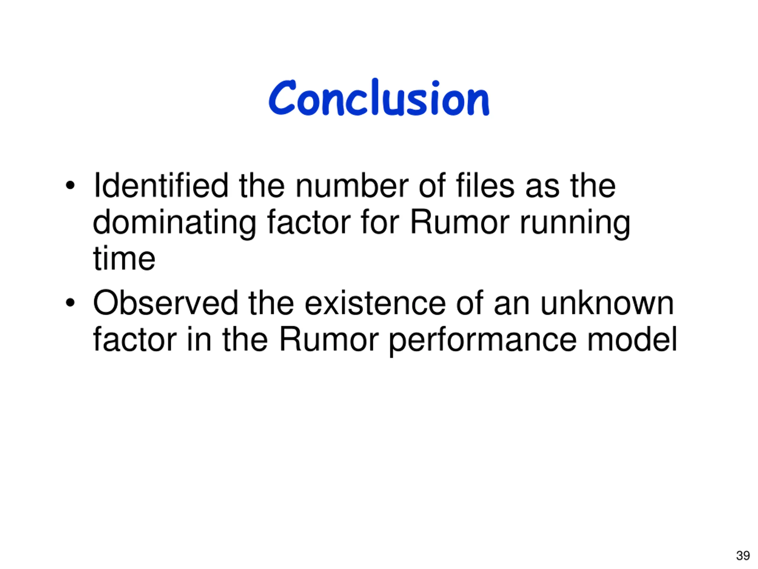 Conclusion Identified the number of files as the dominating factor for Rumor running time Observed the existence of an unknown factor in the Rumor performance model 39