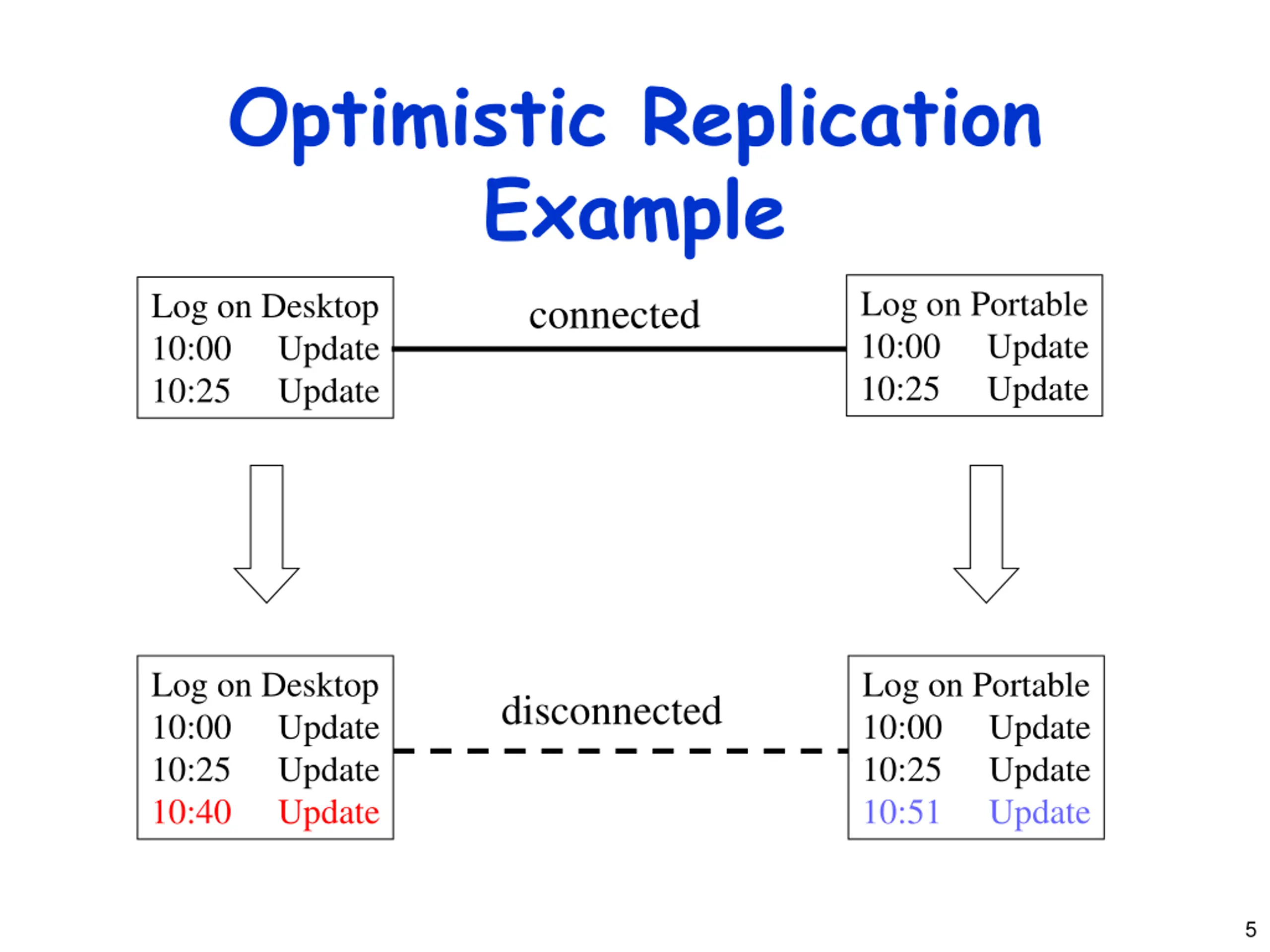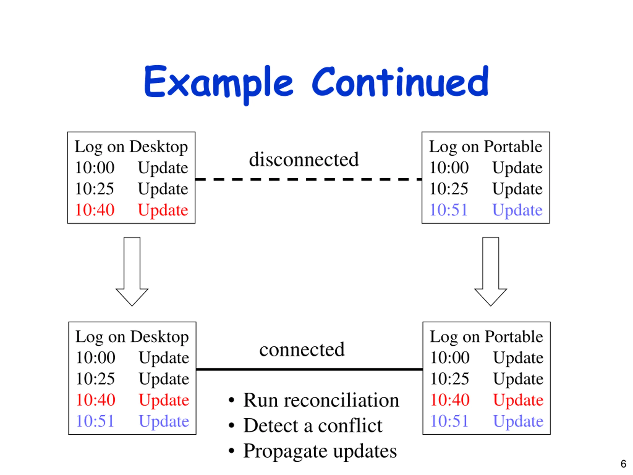 Optimistic Replication Example Log on Portable 10:00 10:25 Log on Desktop 10:00 10:25 connected Update Update Update Update Log on Desktop 10:00 10:25 10:40 Log on Portable 10:00 10:25 10:51 disconnected Update Update Update Update Update Update 5