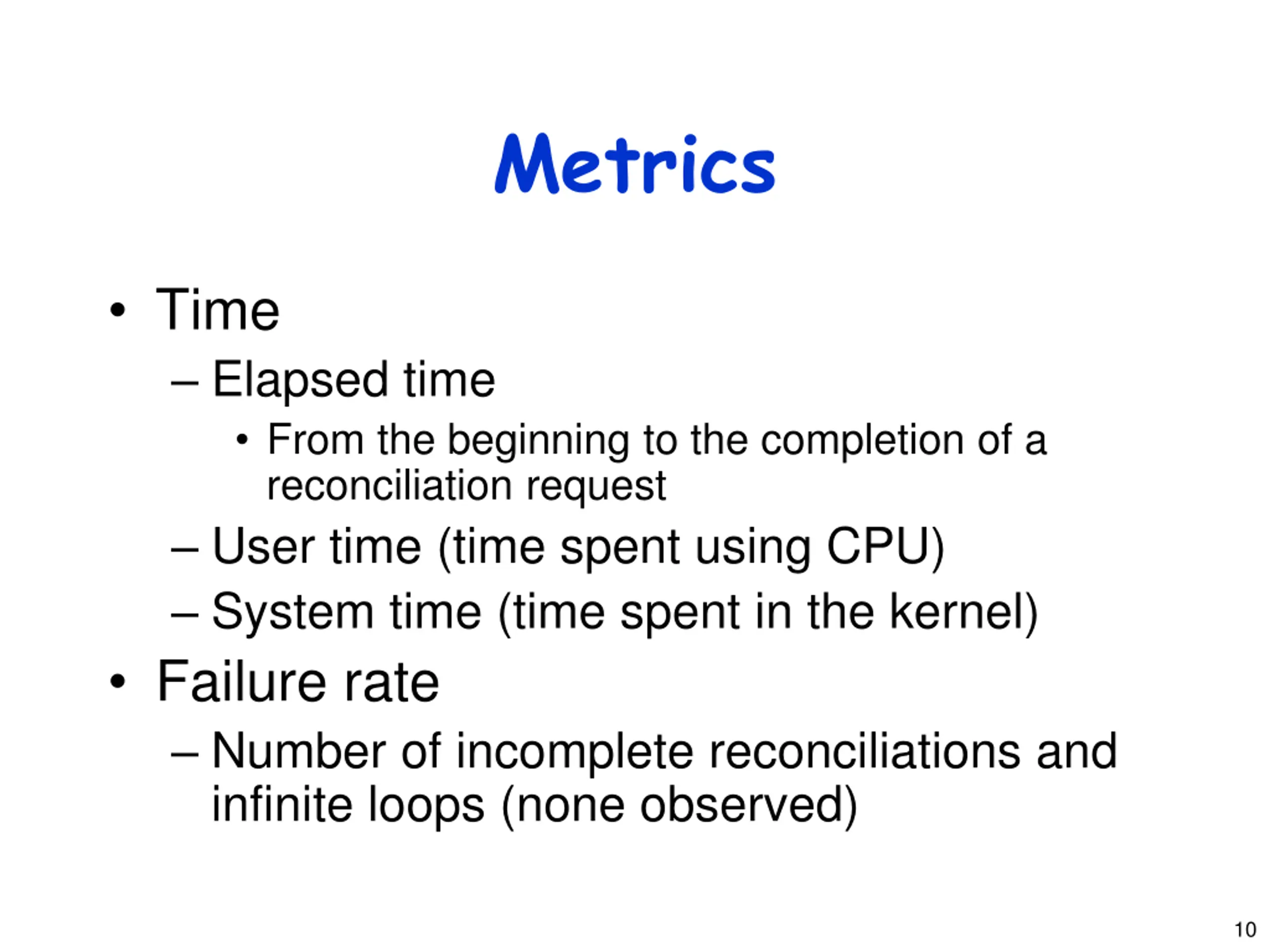 Metrics Time Elapsed time From the beginning to the completion of a reconciliation request User time (time spent using CPU) System time (time spent in the kernel) Failure rate Number of incomplete reconciliations and infinite loops (none observed) 10