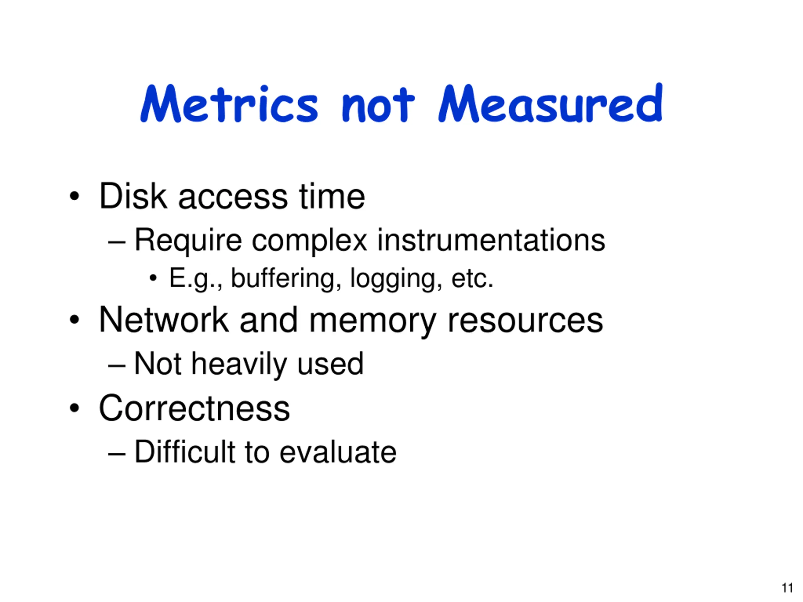 Metrics not Measured Disk access time Require complex instrumentations E.g., buffering, logging, etc. Network and memory resources Not heavily used Correctness Difficult to evaluate 11
