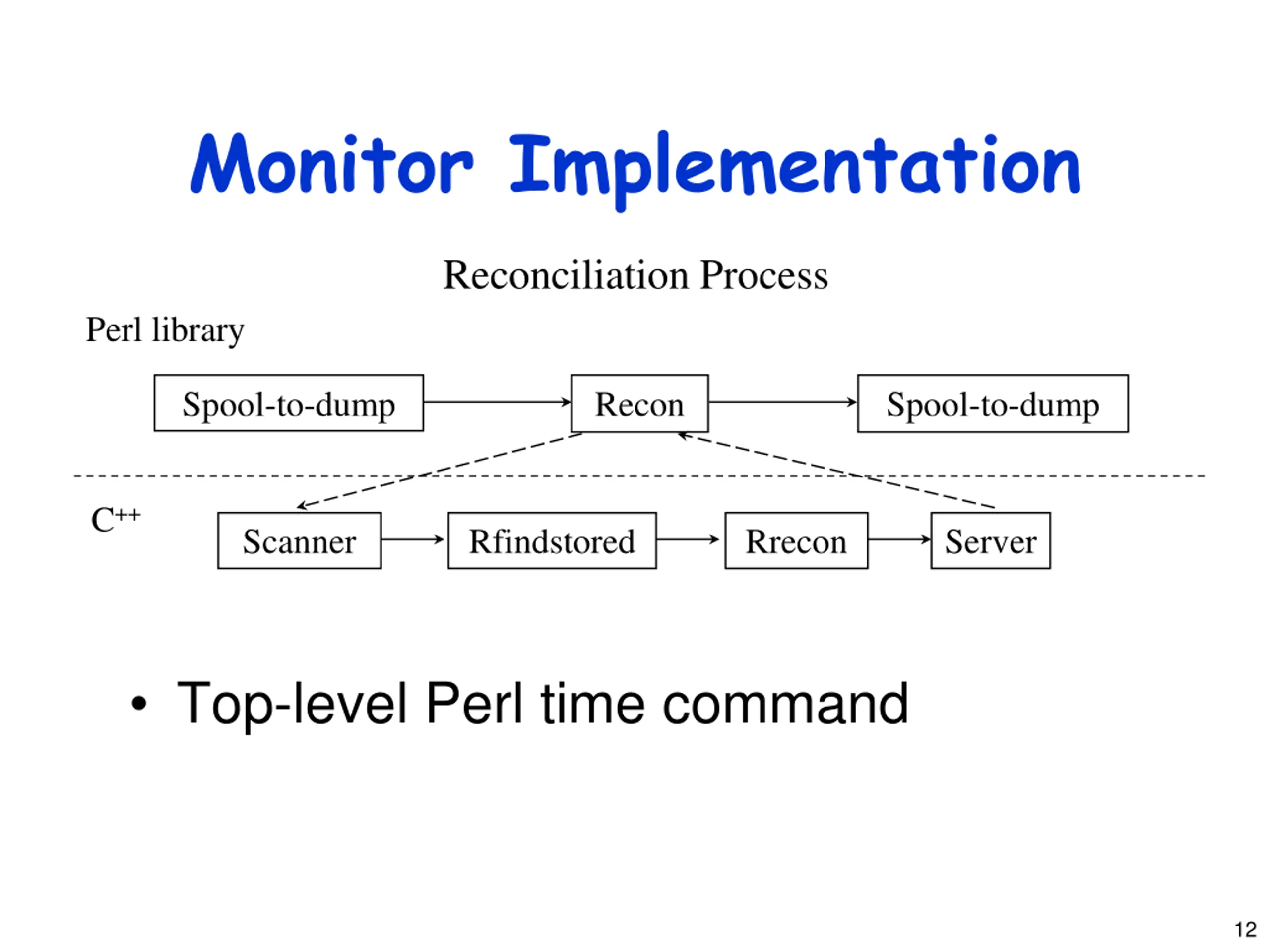 Monitor Implementation Reconciliation Process Perl library Spool-to-dump Recon Spool-to-dump C++ Scanner Rfindstored Rrecon Server Top-level Perl time command 12