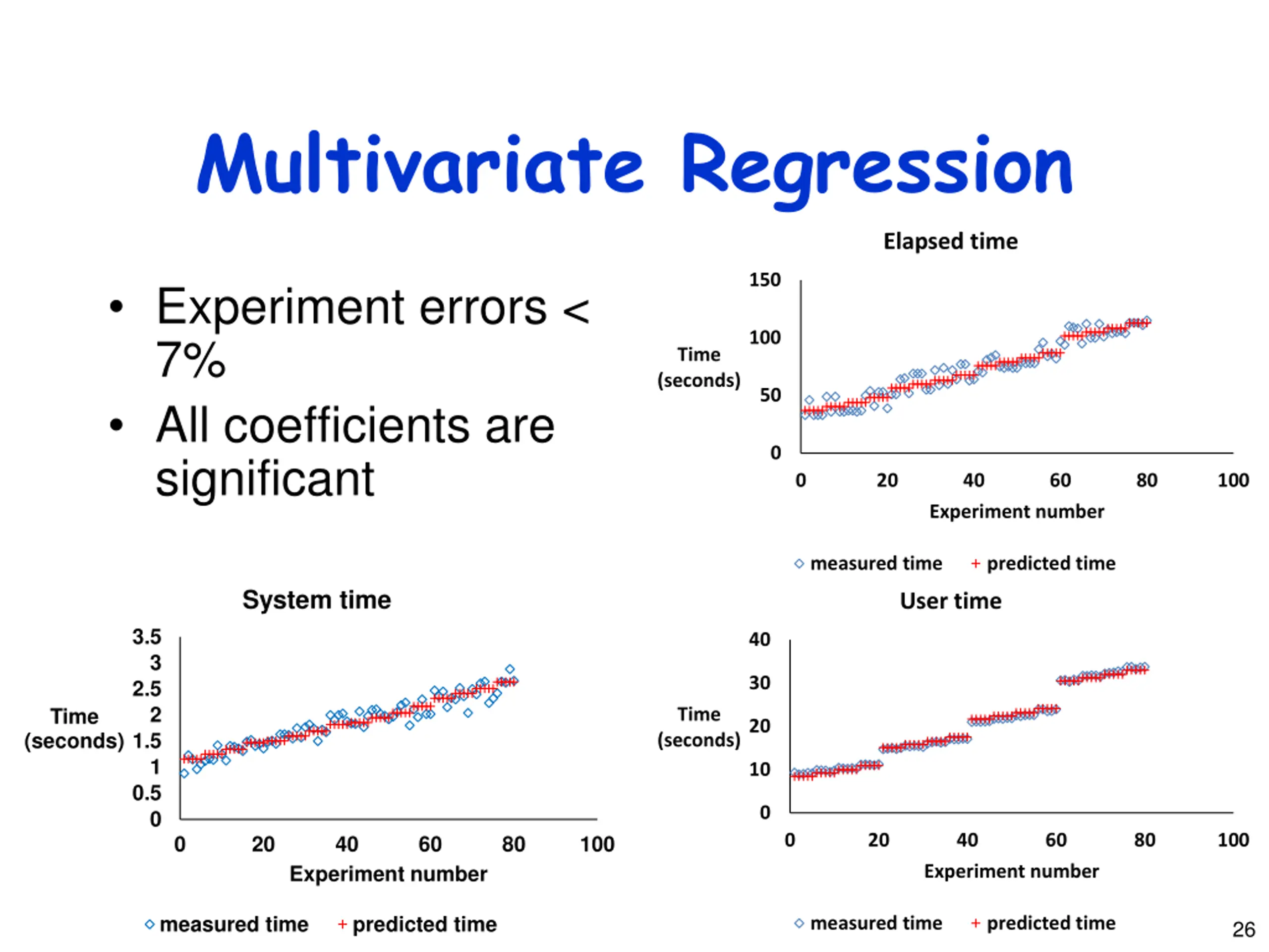 Multivariate Regression Elapsed time 150 Experiment errors < 7% All coefficients are significant 100 Time (seconds) 50 0 0 20 40 60 80 100 Experiment number measured time predicted time System time User time 3.5 40 3 30 2.5 2 Time (seconds) Time (seconds) 20 1.5 1 10 0.5 0 0 0 20 40 60 80 100 0 20 40 60 80 100 Experiment number Experiment number measured time predicted time measured time predicted time 26