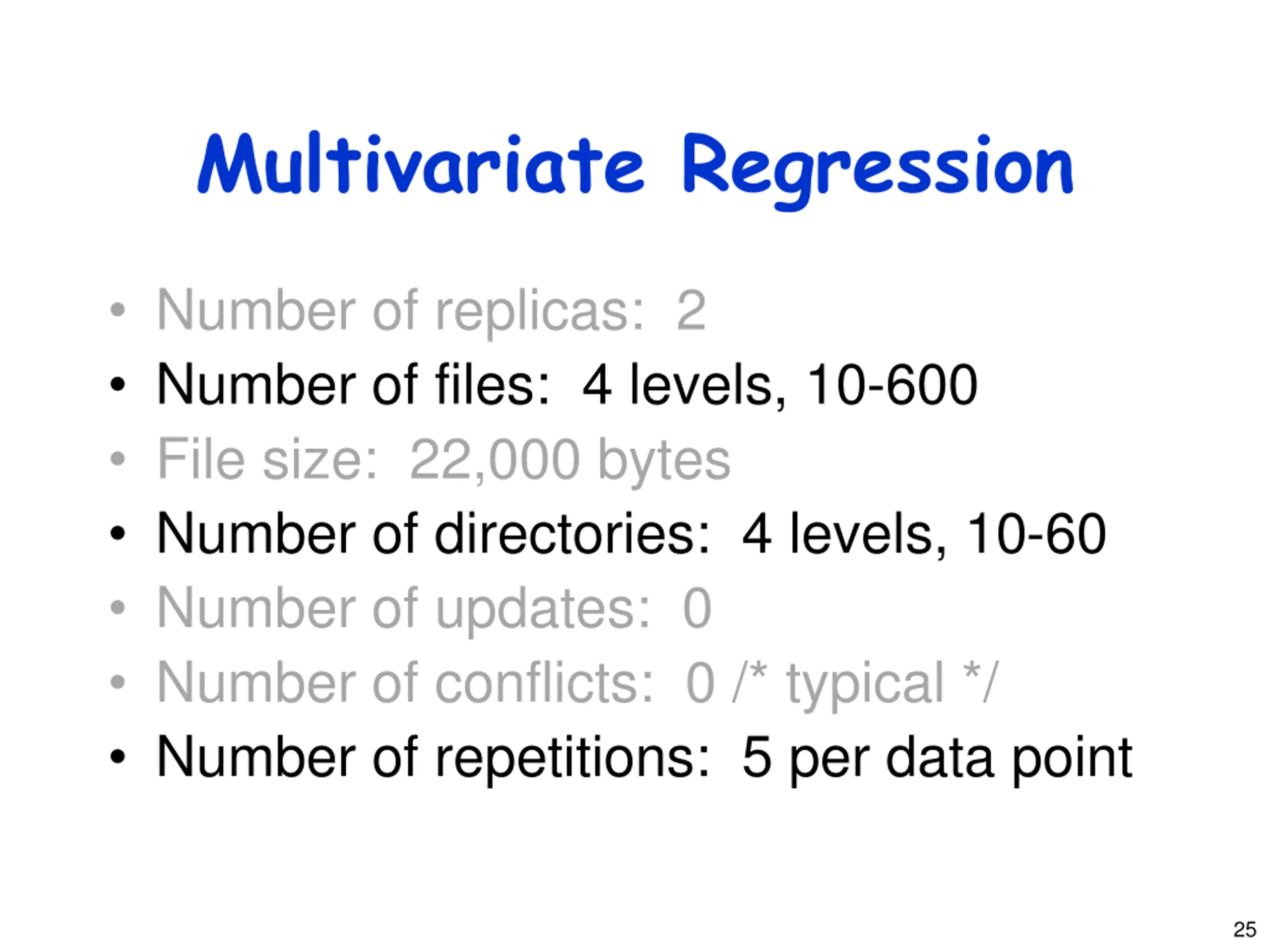 Multivariate Regression Number of replicas: 2 Number of files: 4 levels, 10-600 File size: 22,000 bytes Number of directories: 4 levels, 10-60 Number of updates: 0 Number of conflicts: 0 /* typical */ Number of repetitions: 5 per data point 25